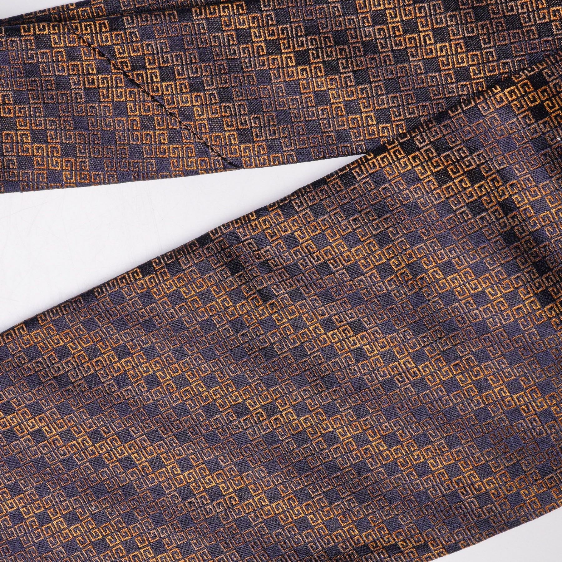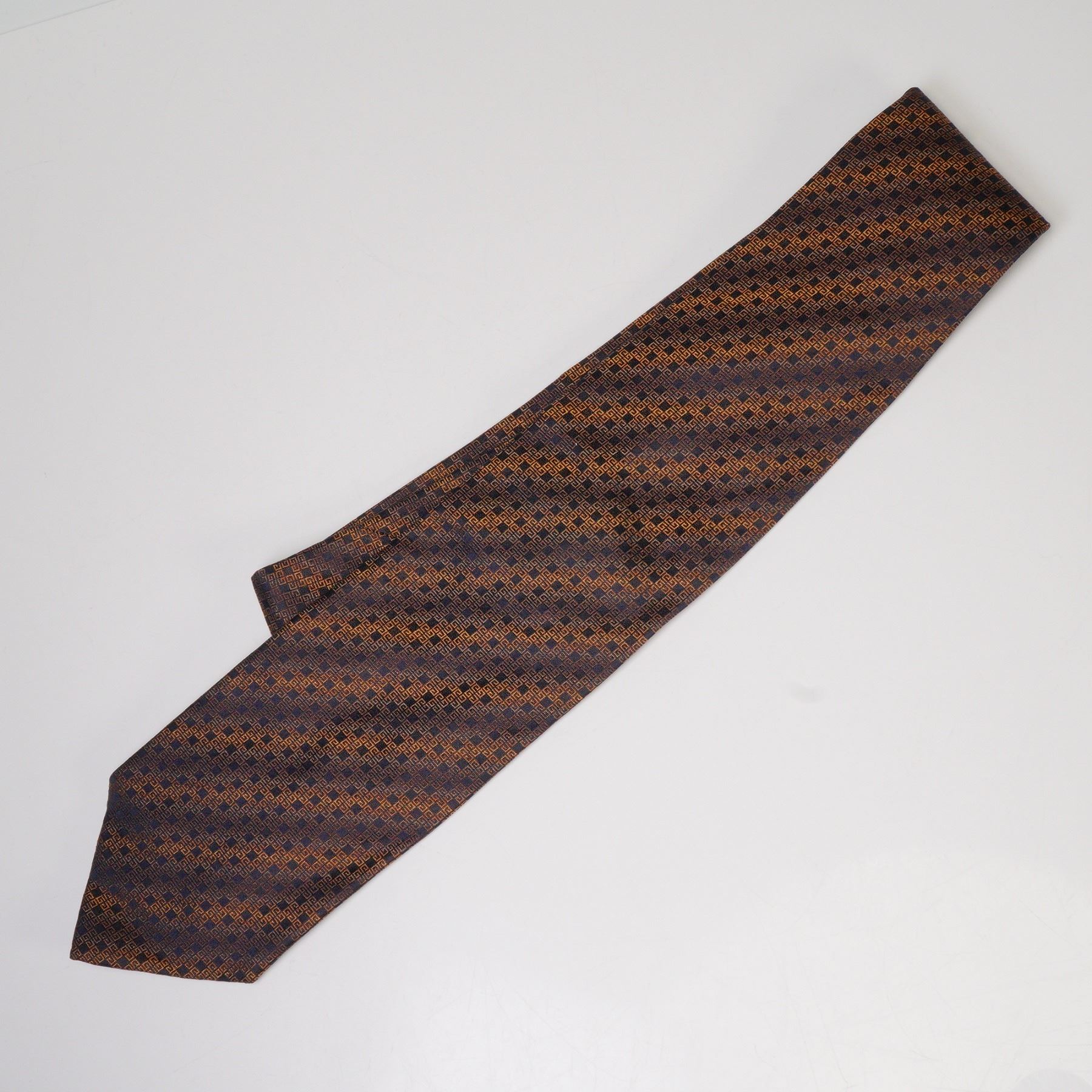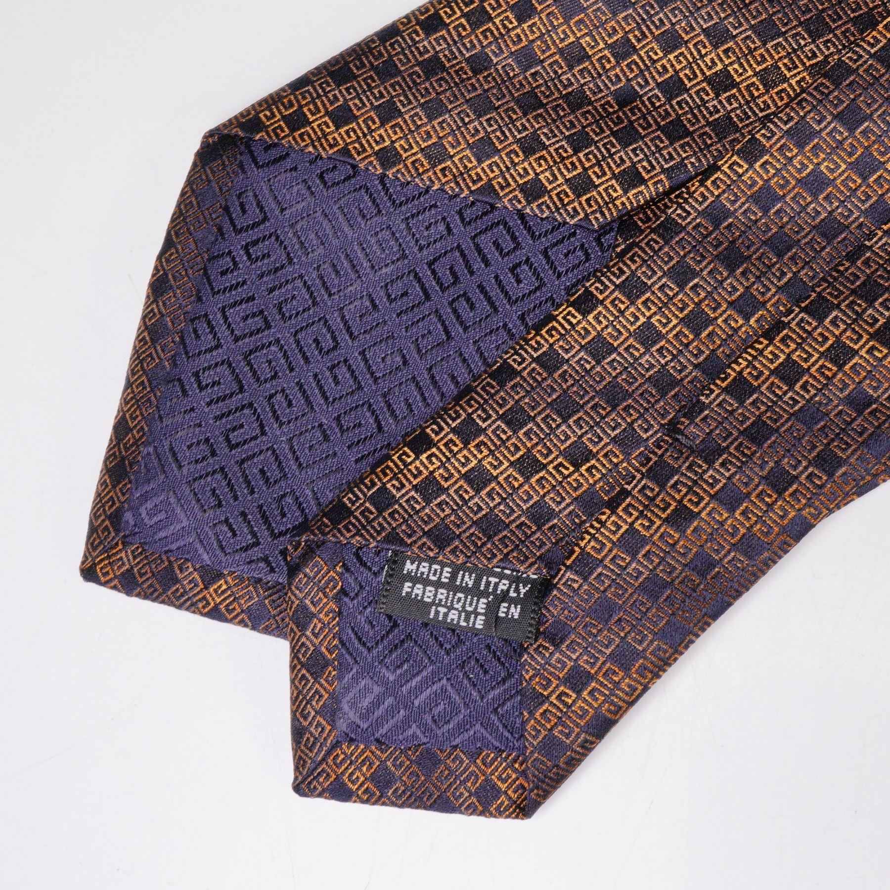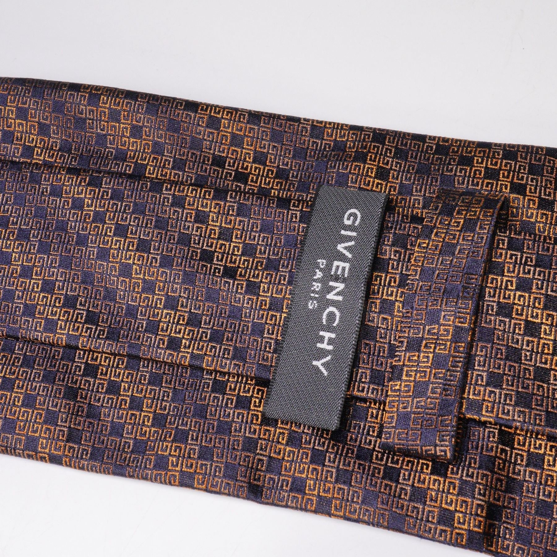 Givenchy Paris silk tie made in Italy, featuring an intricate geometric pattern in shades of bronze and navy blue. The design displays a repeating square motif woven into the fabric, giving the tie a rich texture and sheen. The underside carries the Givenchy Paris label and a Made in Italy tag, confirming its quality craftsmanship.