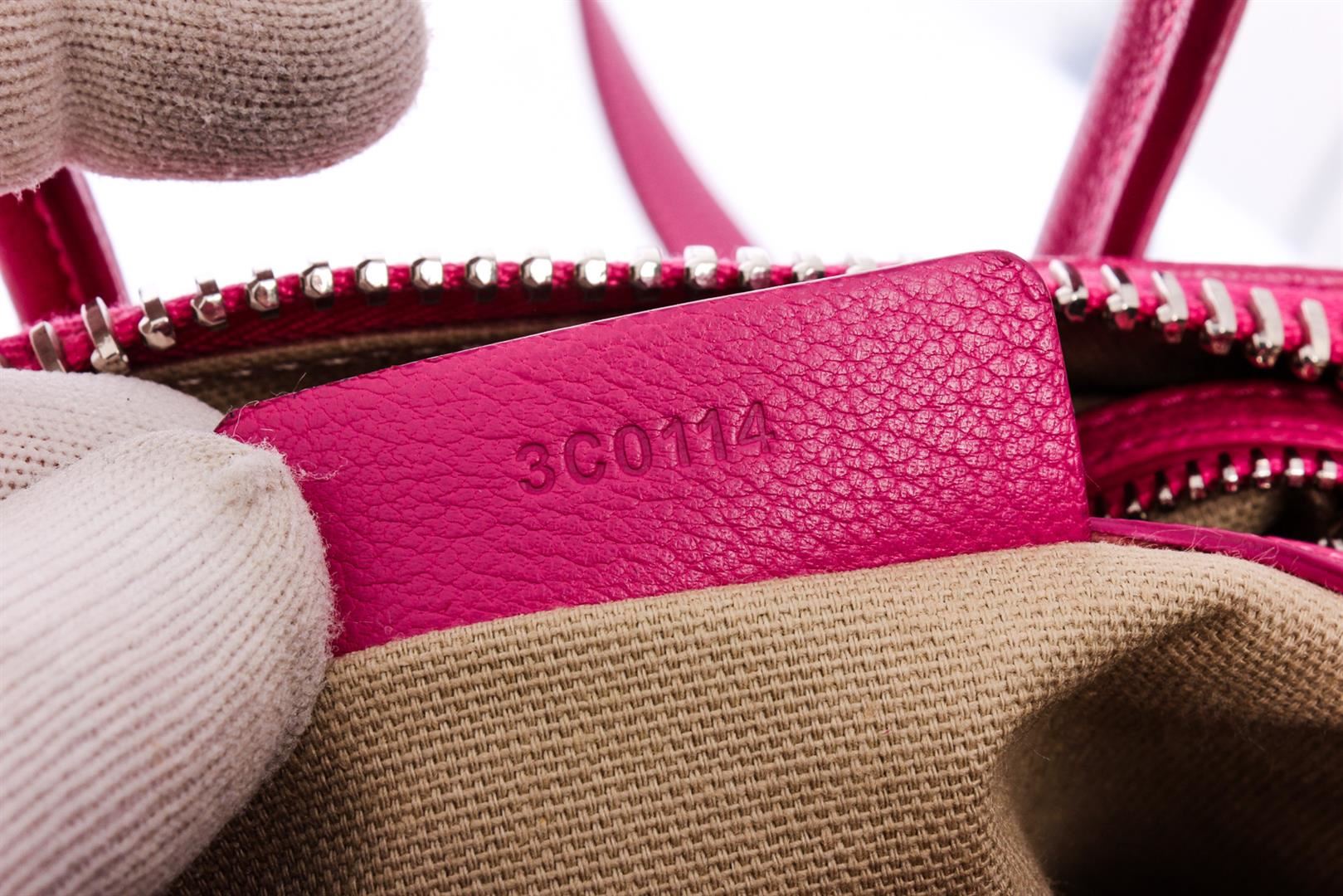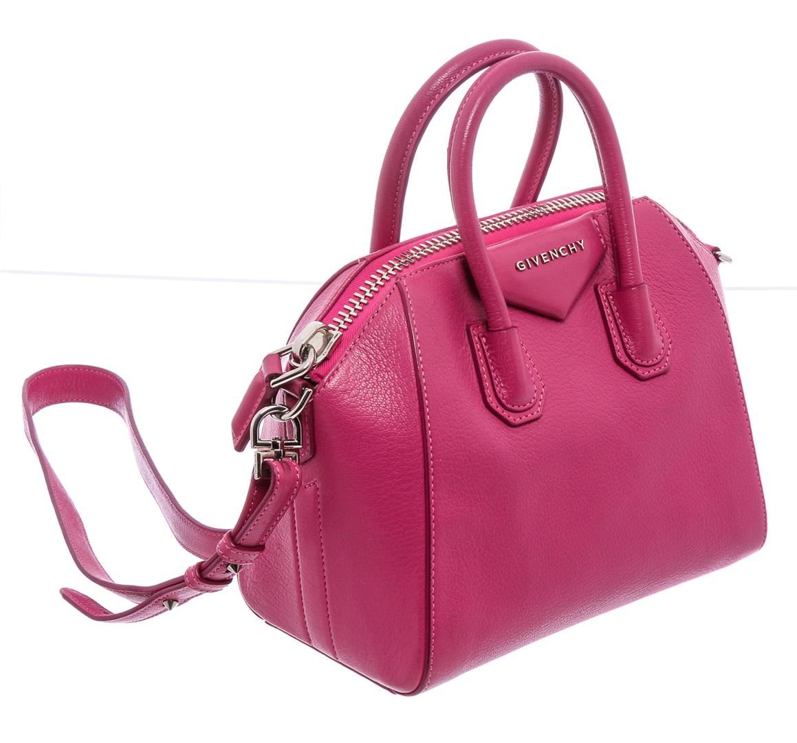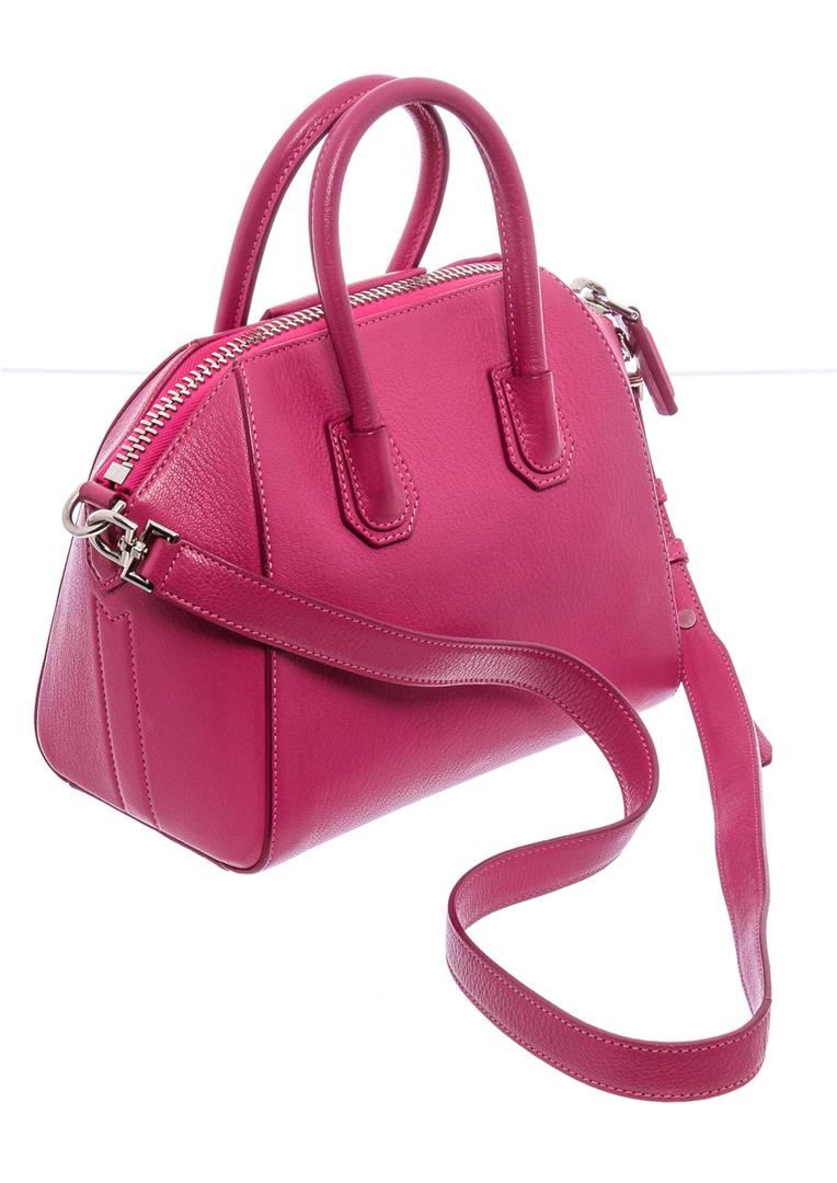Pink grained leather Givenchy Mini Antigona satchel with silver-tone hardware, dual rolled top handles, detachable flat shoulder strap, creme canvas lining, three interior pockets; one with zip closure and zip closure at top.