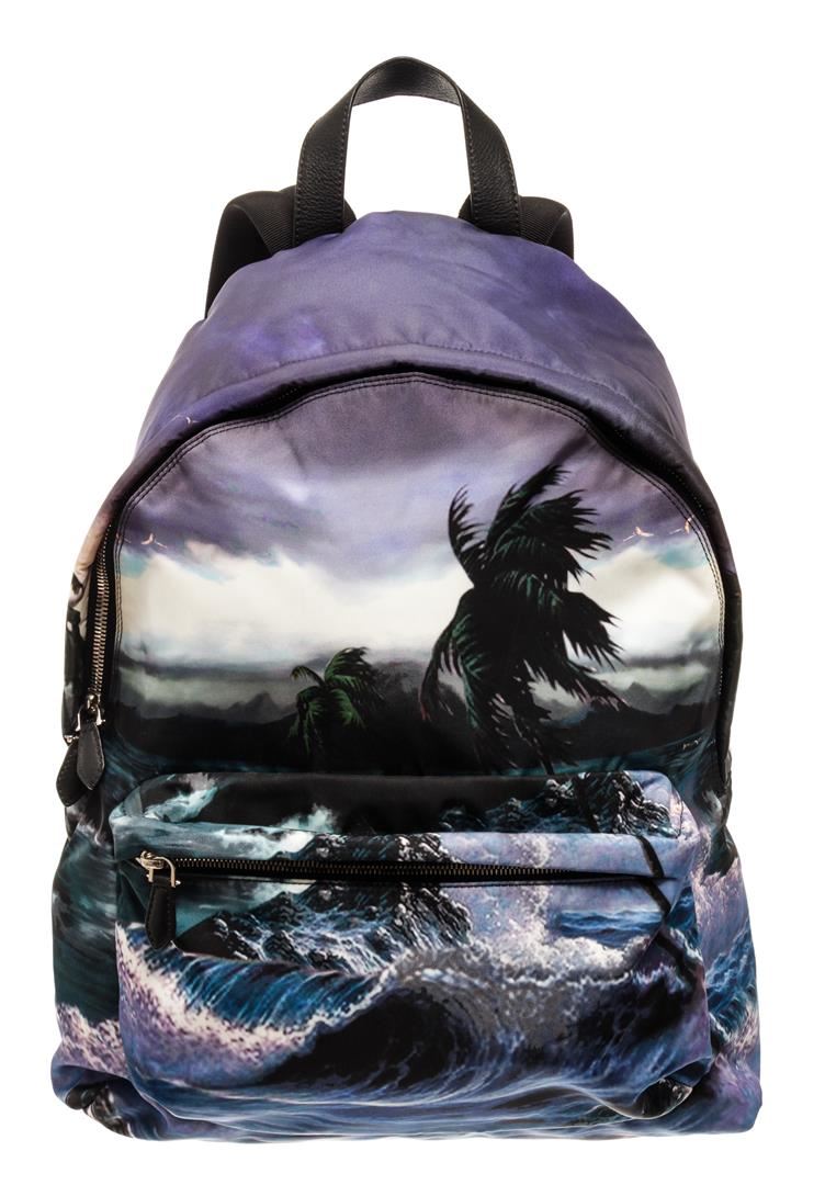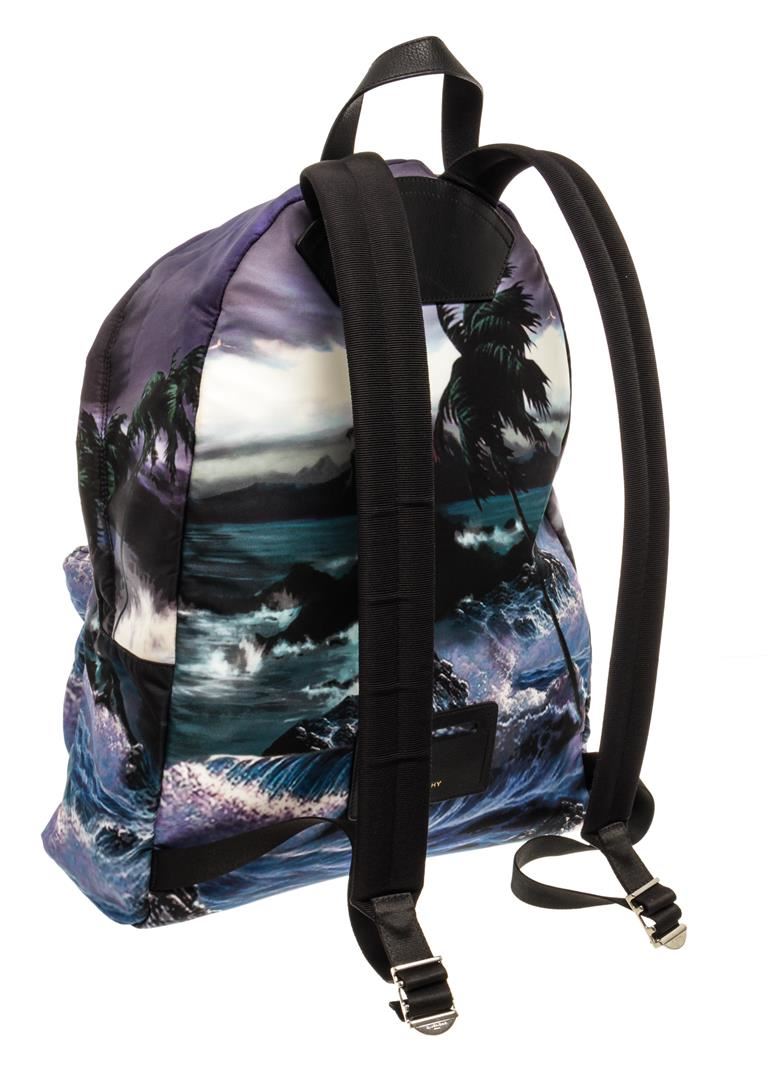One Givenchy Printed Beach Canvas Pocket Backpack. Item is sold AS-IS. All available information is listed in the description and shown in the photo. Givenchy Printed Beach Canvas Pocket Backpack features black canvas interior, silver toned hardware, two exterior pockets, black leather top handle and two dual straps.