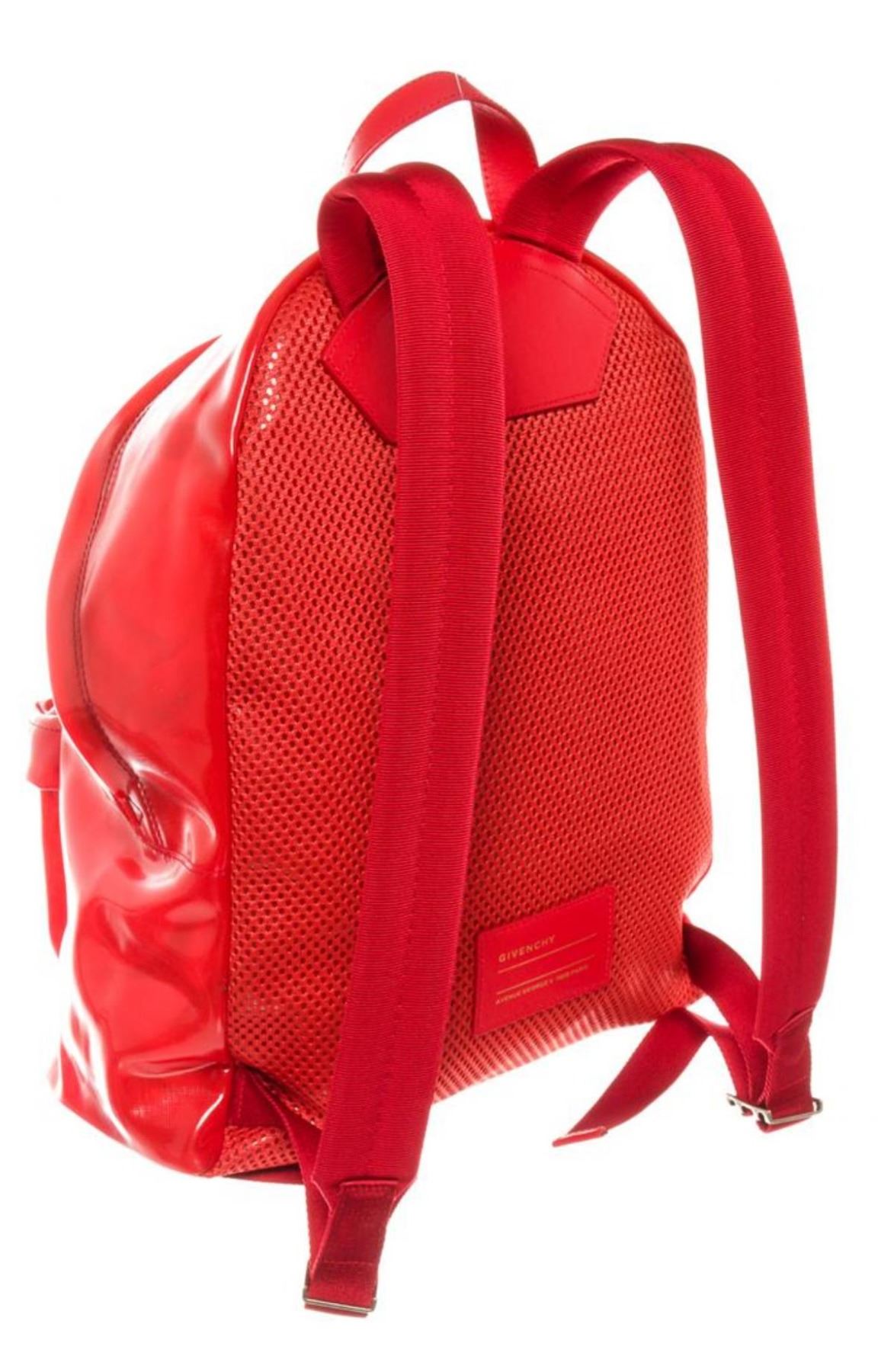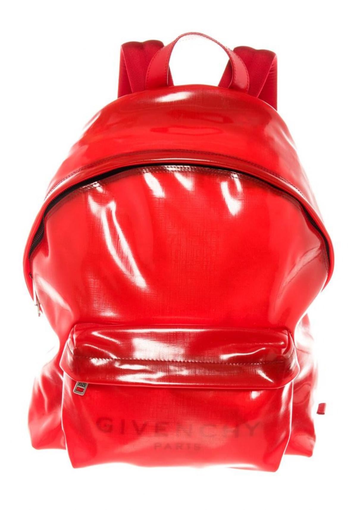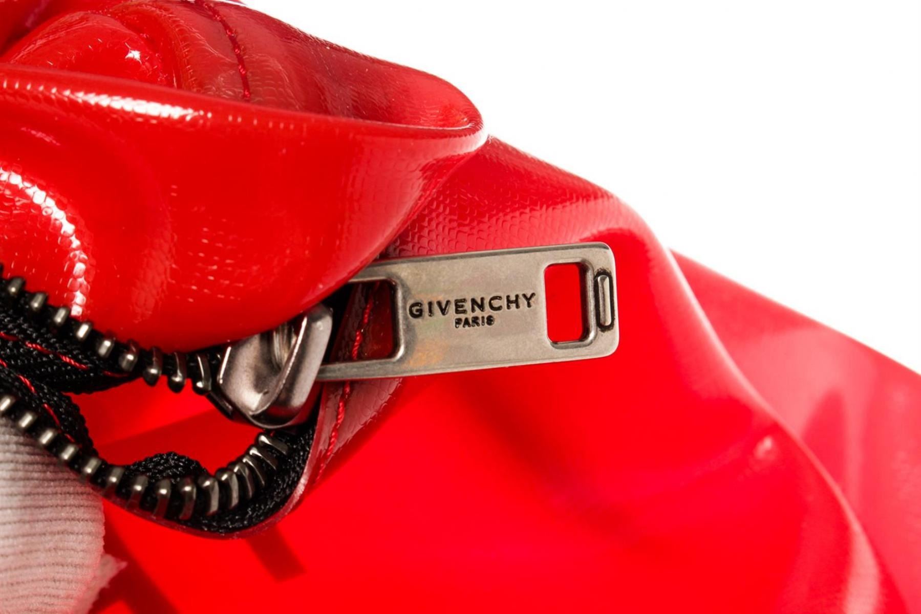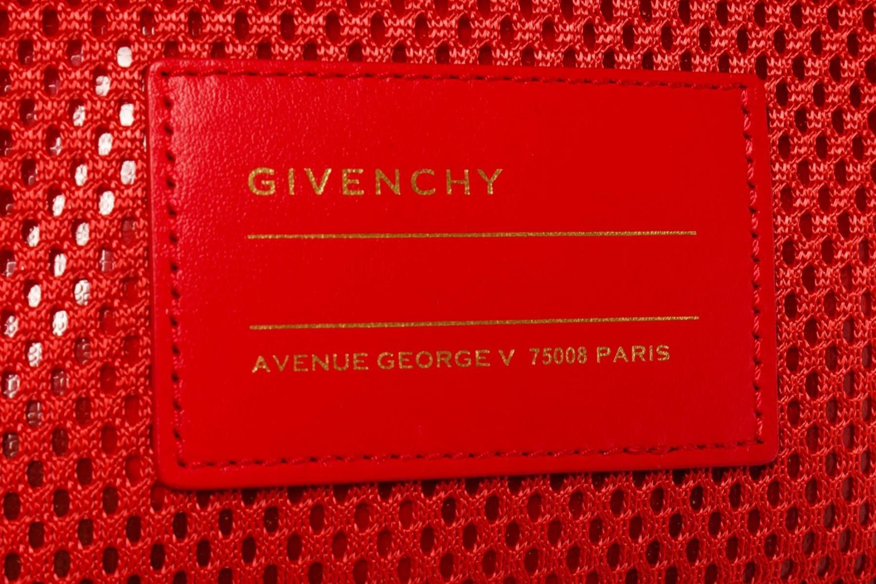 Red recyclable transparent PVC Givenchy City backpack with silver-tone hardware, red leather trim, Givenchy Paris front print, inner zipped pocket, red canvas shoulder straps, red leather handle, mesh back and double slider zip closure. Width: 11.8", H
