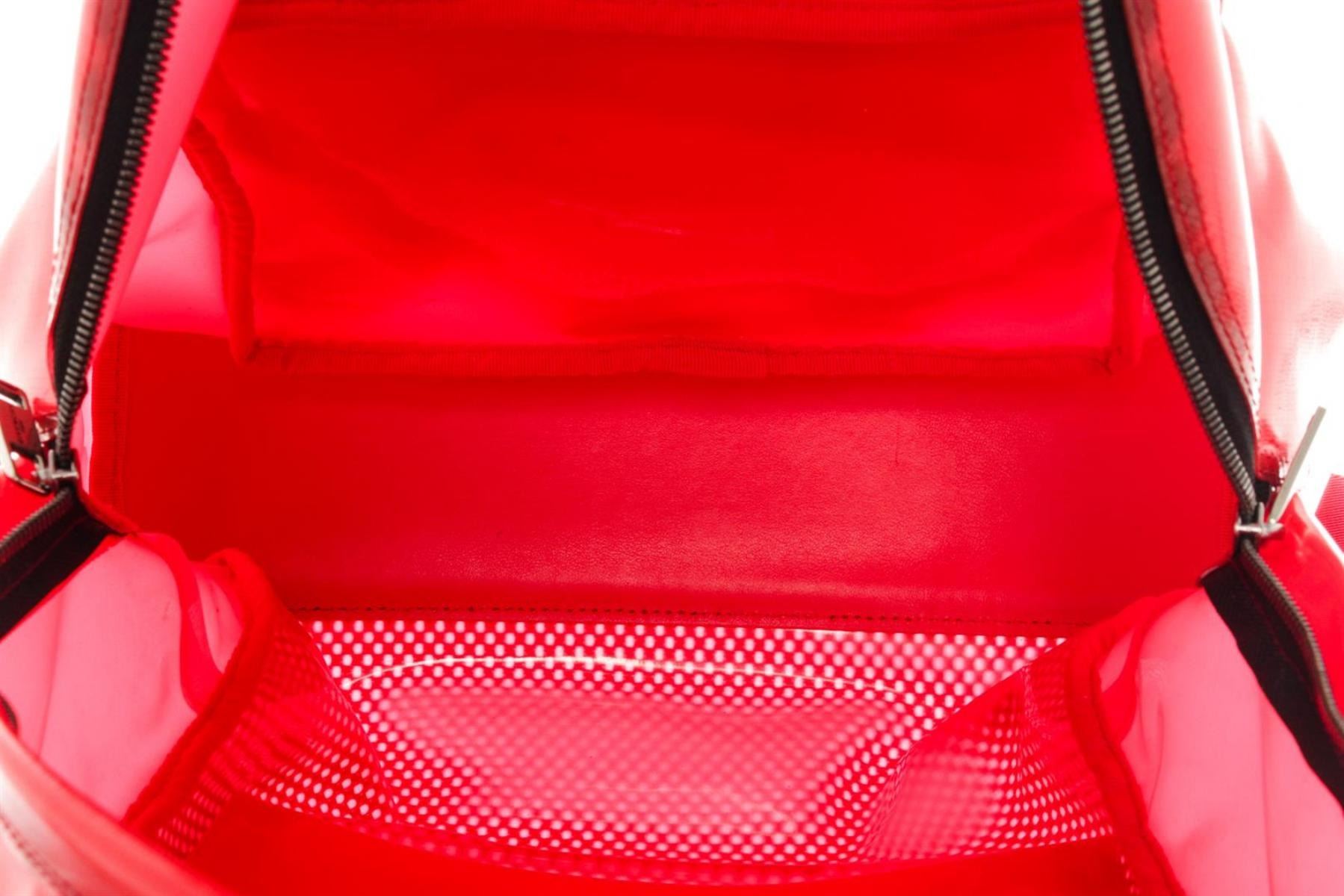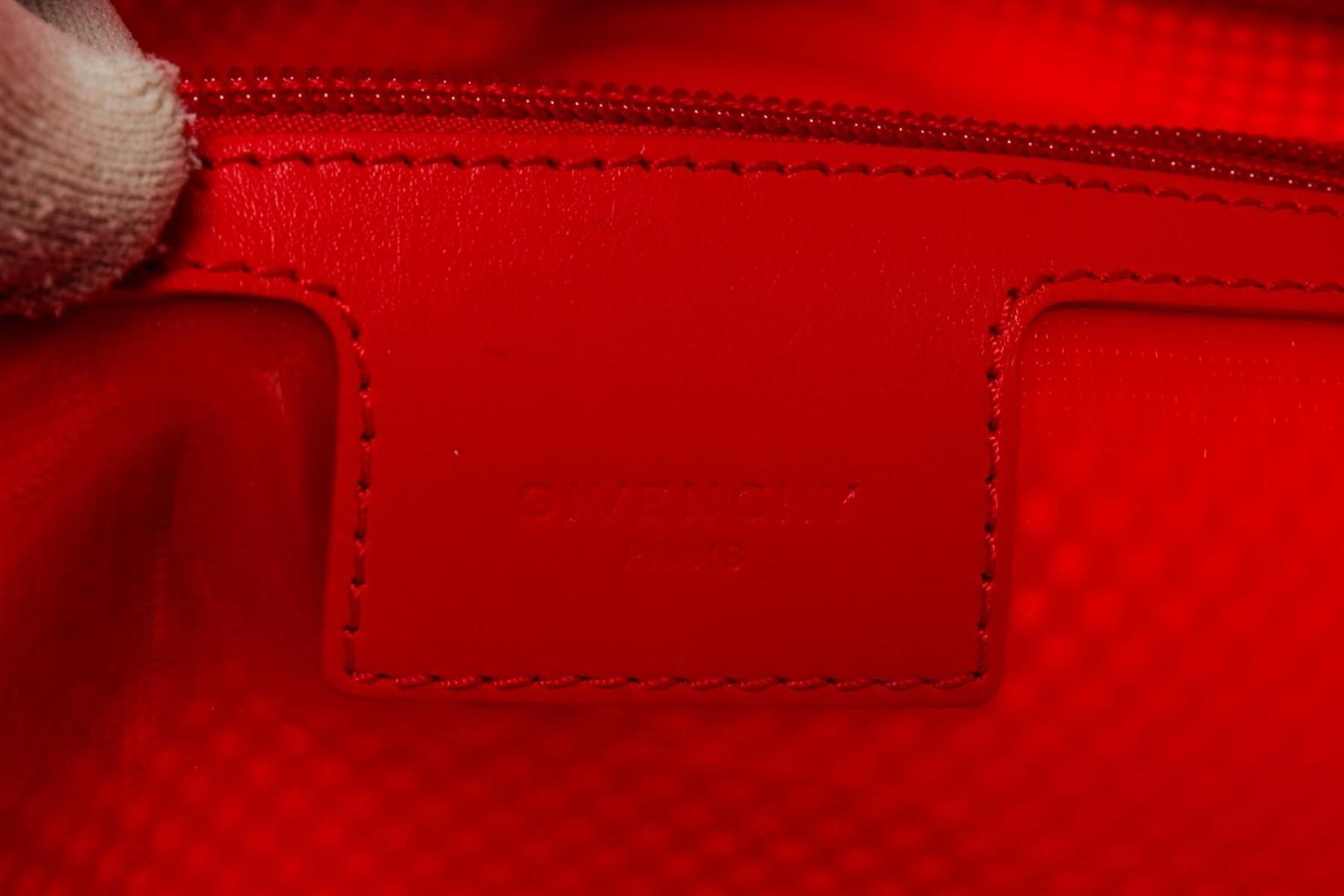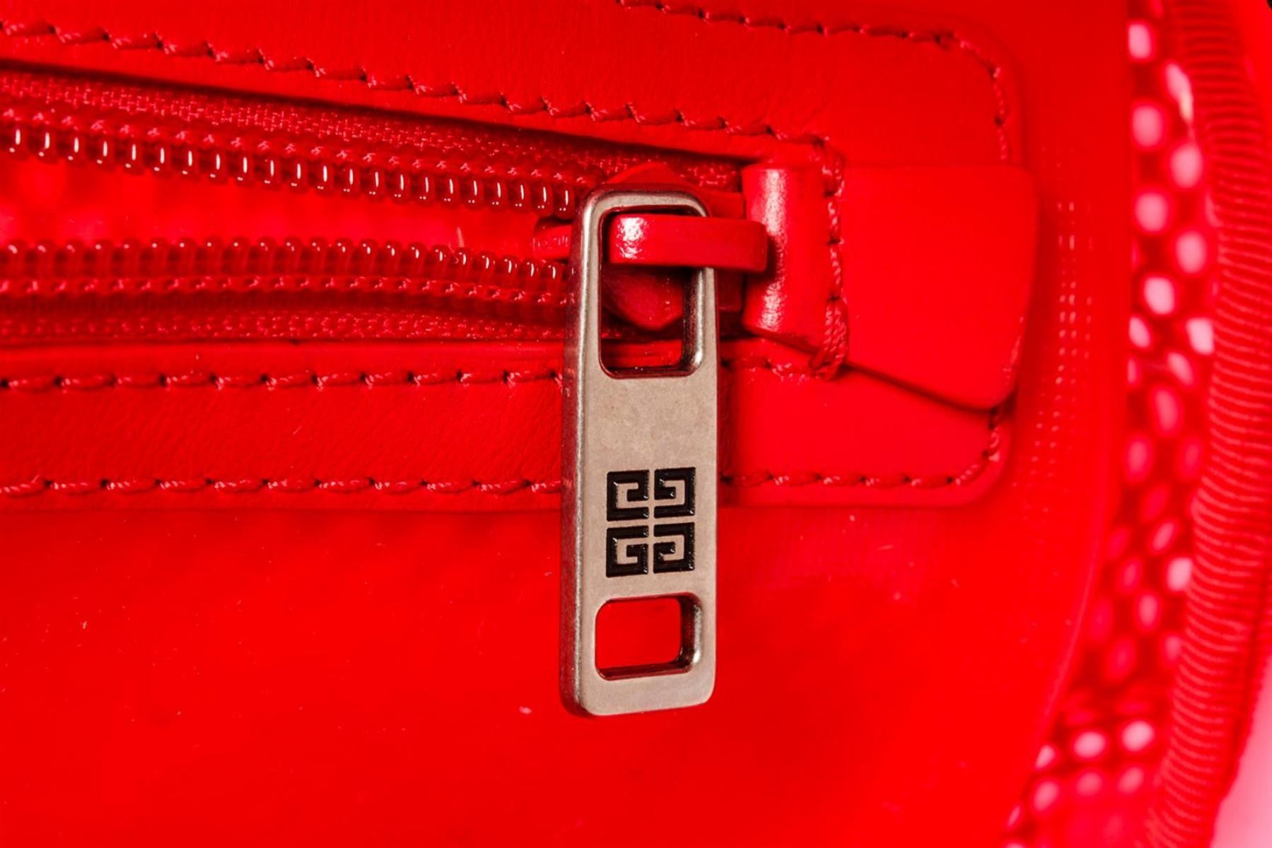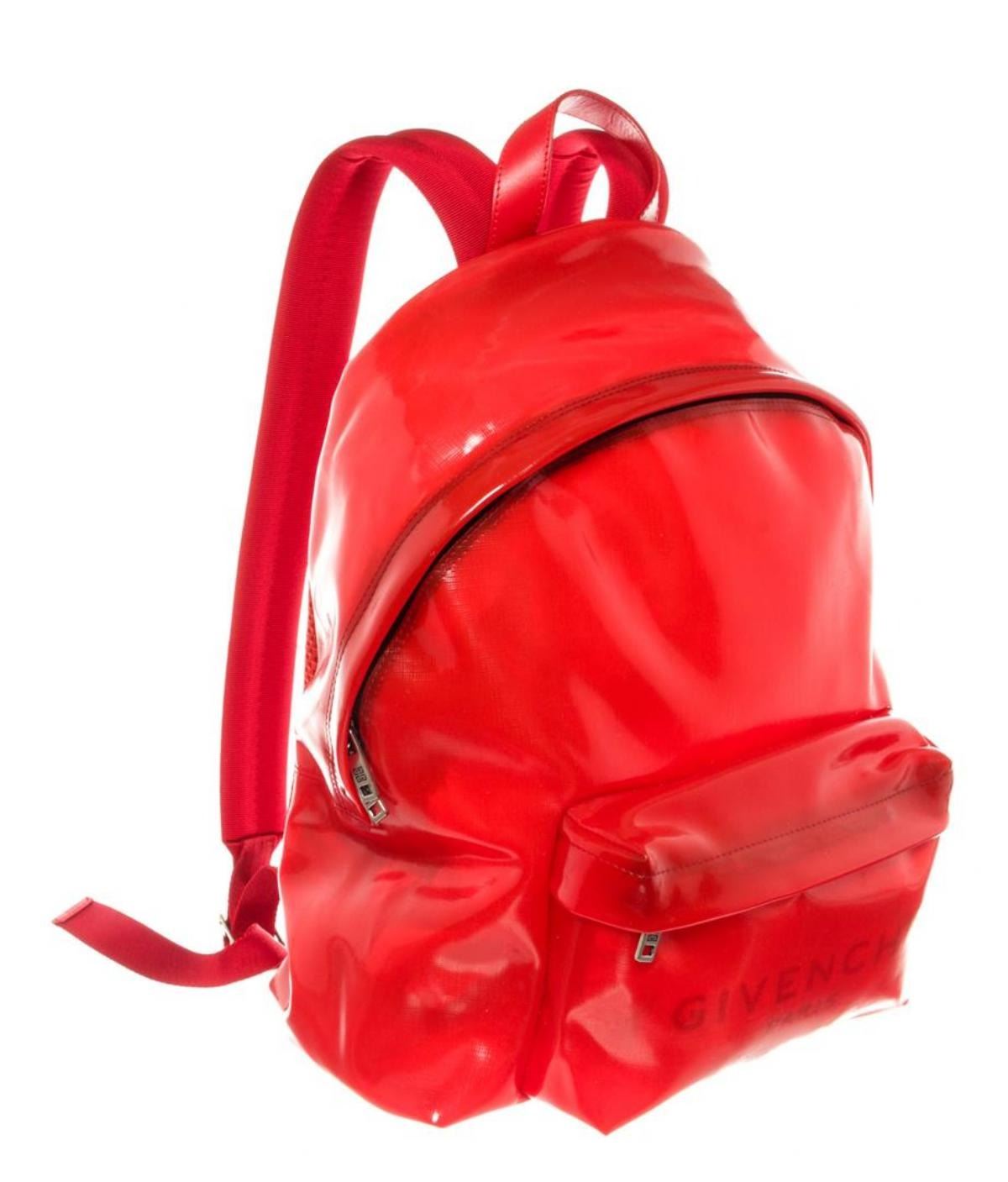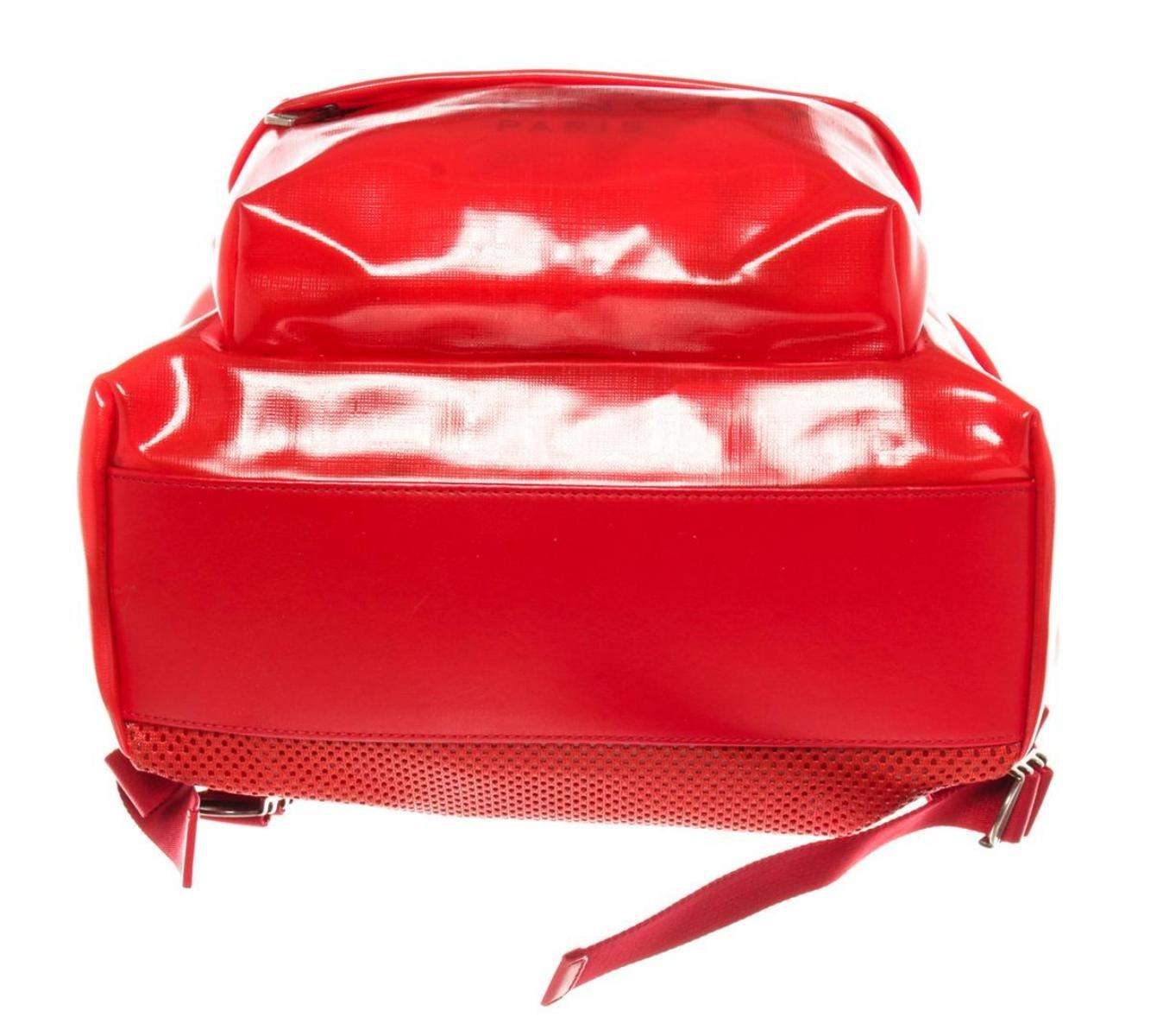Red recyclable transparent PVC Givenchy City backpack with silver-tone hardware, red leather trim, Givenchy Paris front print, inner zipped pocket, red canvas shoulder straps, red leather handle, mesh back and double slider zip closure. Width: 11.8", H