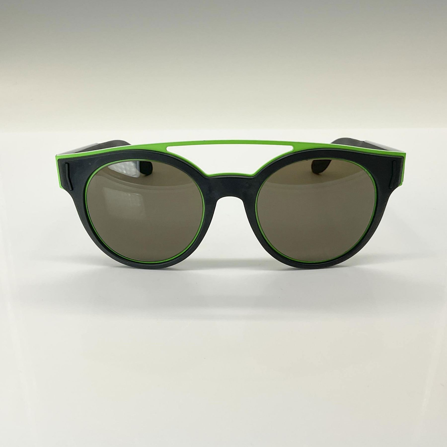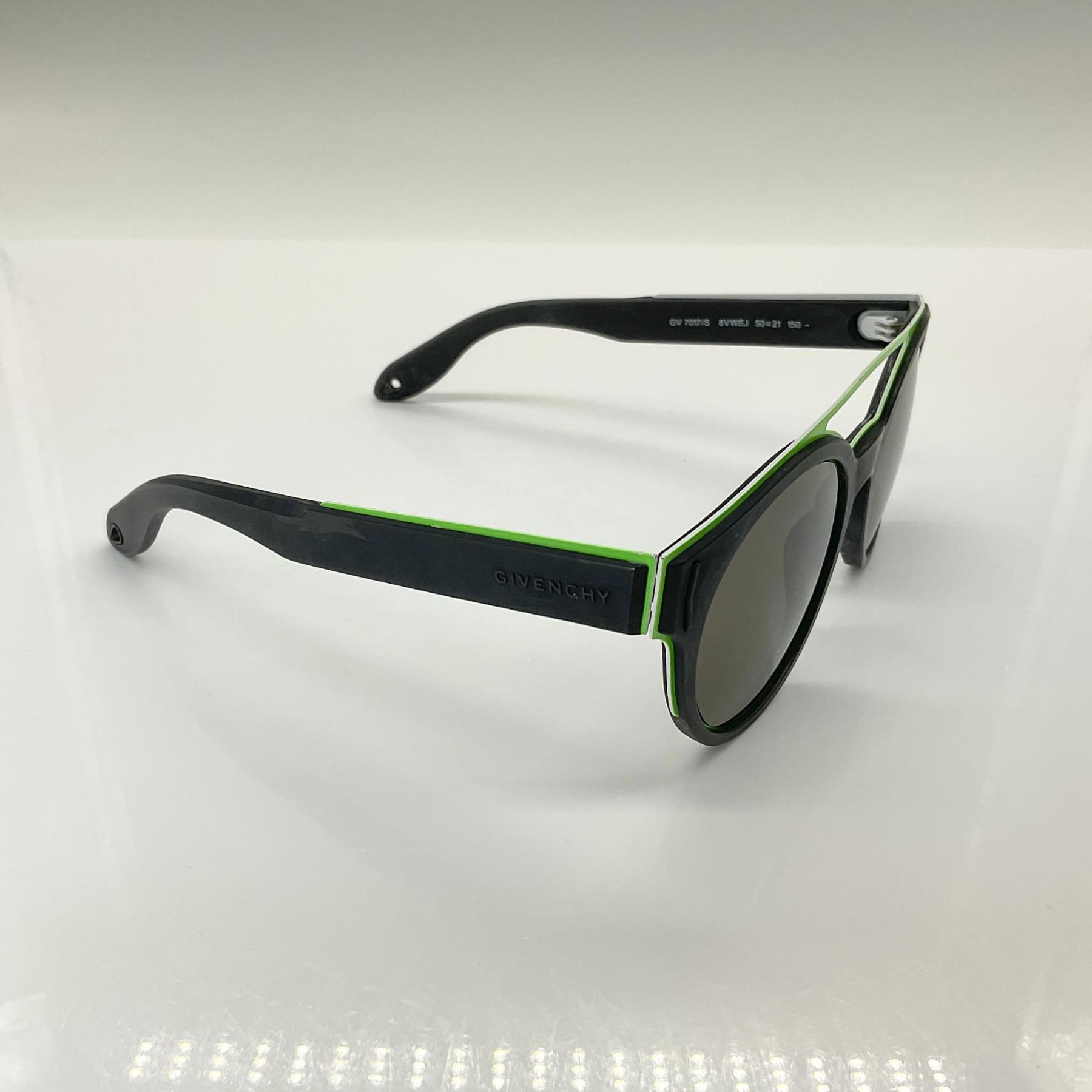 These expertly crafted Givenchy round sunglasses feature electric green acetate and metal frames paired with sleek gray-tinted lenses. Accented with the iconic Givenchy logo on the temples, these sunglasses are a chic choice for making a bold and stylish statement. Frame size: 50/21/150. This item has its original case: 7.25"L x 3"W x 2"H. Glasses dimensions: 5.5"L x 2.25"H. Dimensions: See Description