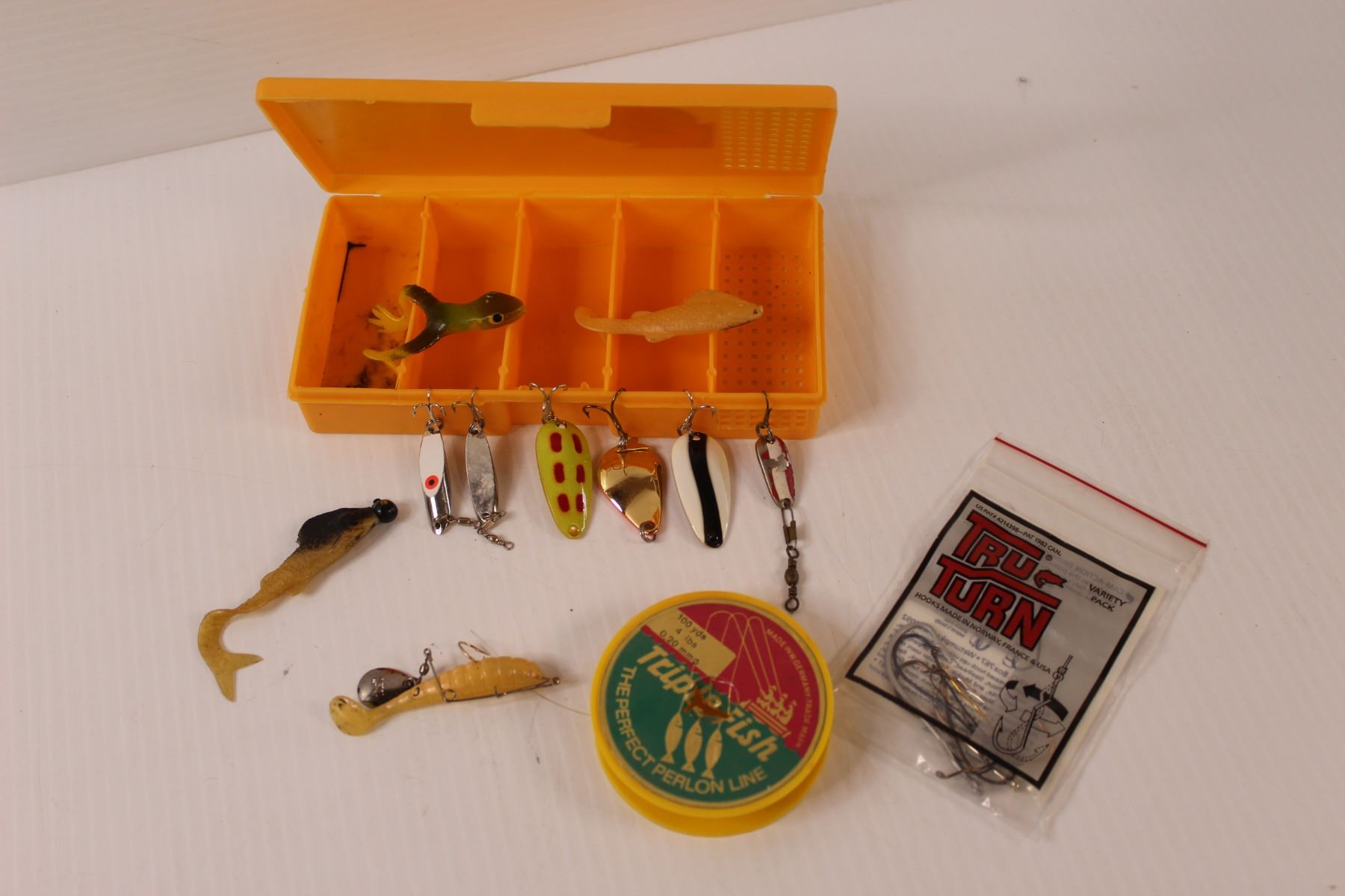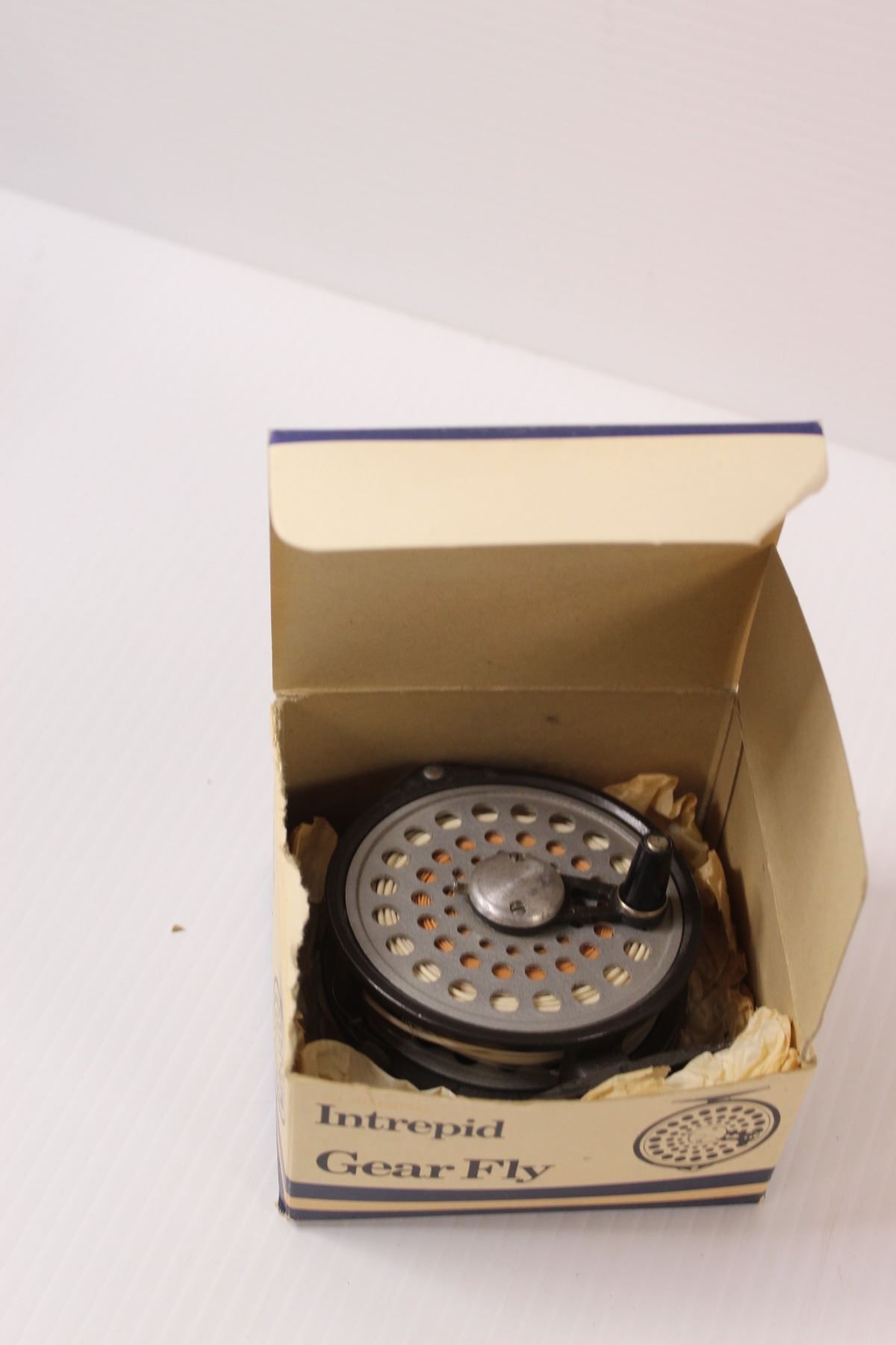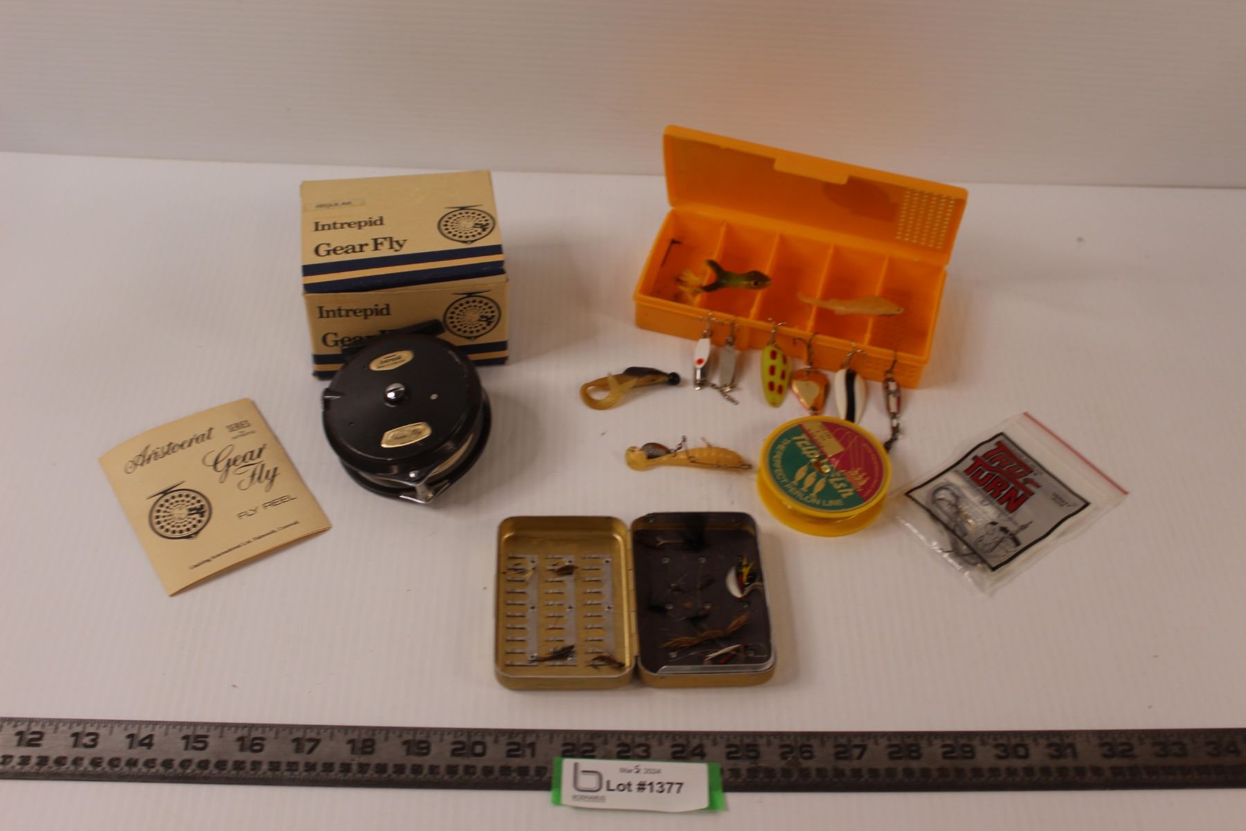 Gladding Intrepid Fly Fishing Reel with Box & Small Tackle Box with Spoons/Jigs & J-Hooks, Perrine #69 Fly box with Flys