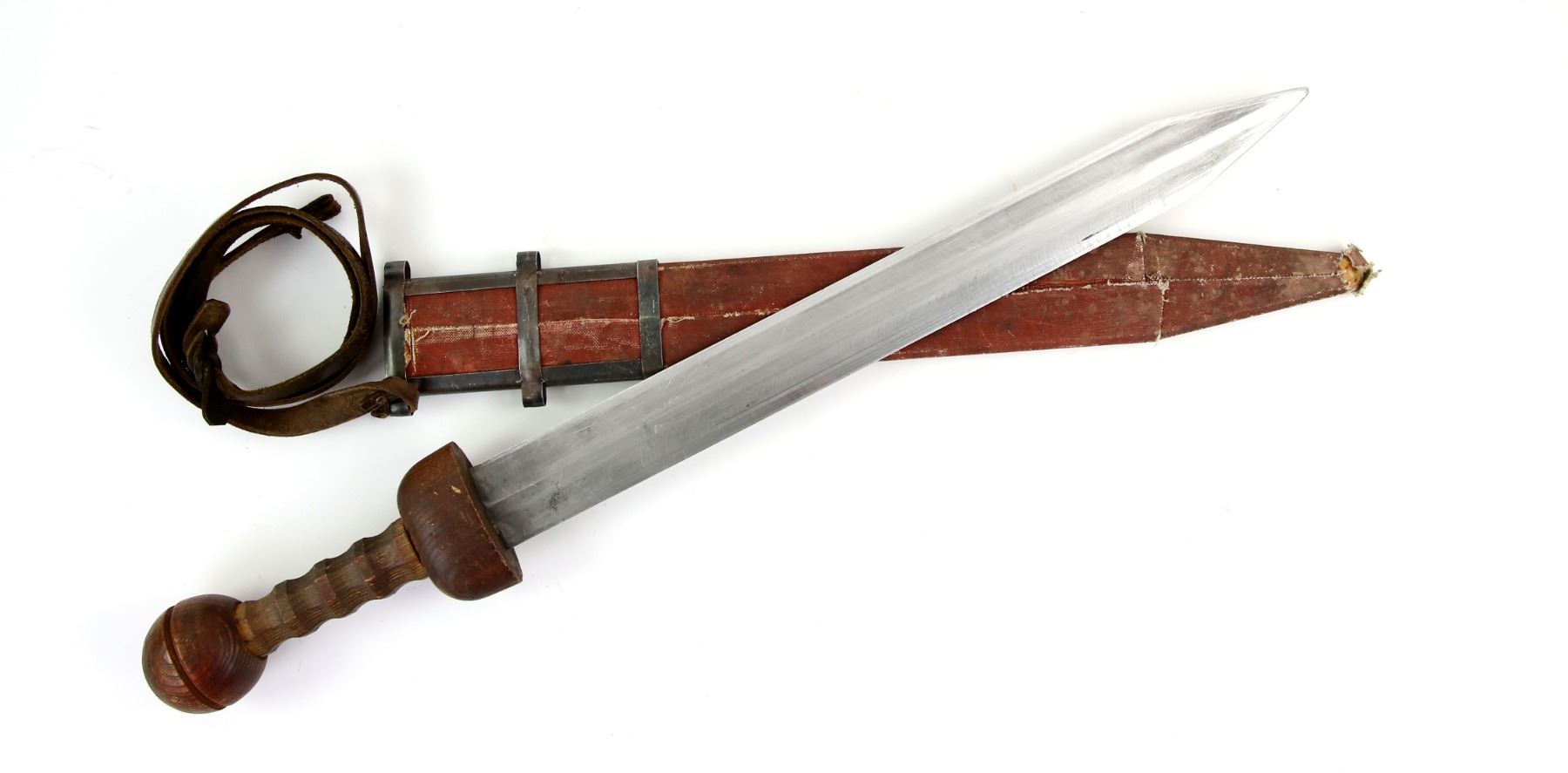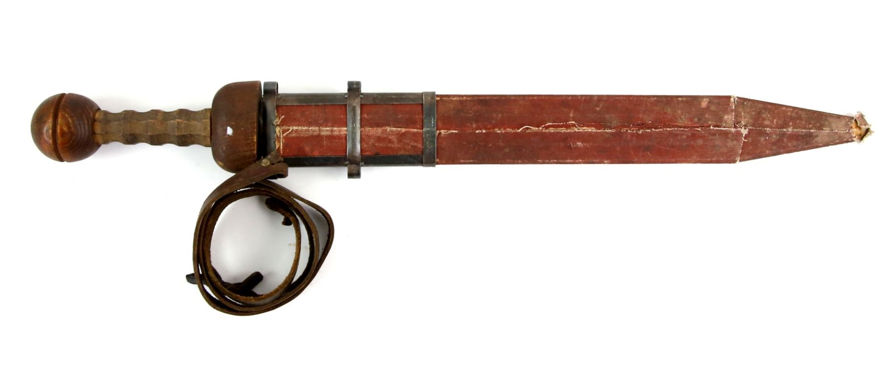 Gladiator (2000) - Production used Roman soldier stunt sword and sheath from the Ridley Scott classic, carved wood and metal, 80cm.