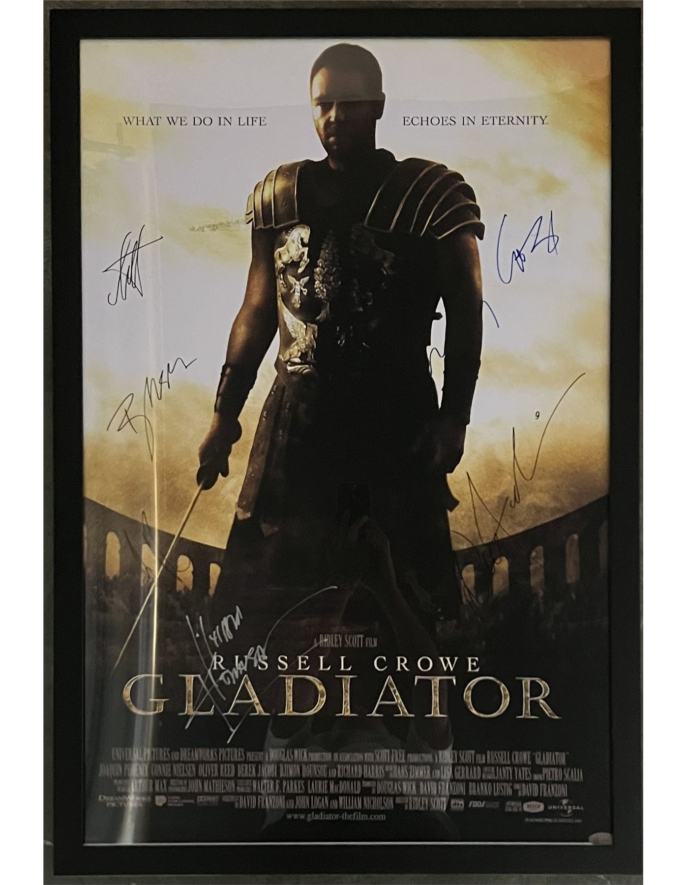 Gladiator cast signed movie poster autographed by Russell Crowe, Joaquin Phoenix, Ridley Scott, Djimon Hounsou, Connie Nielsen and Richard Harris. 26x39 inches