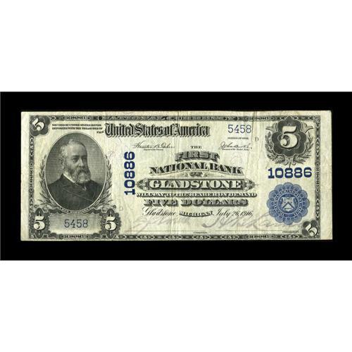<B>Gladstone, MI</B></I> - $5 1902 Plain Back Fr. 606 <B>The First NB</B></I> Ch. # 10886<BR>An evenly circulated example with a higher serial number. <B>Fine-Very Fine.</B></I><BR><BR><b>Shipping:</b> Coins & Currency (<a target="_blank" href="http://www.heritageauctions.com/common/shipping.php">view shipping information</a>)
