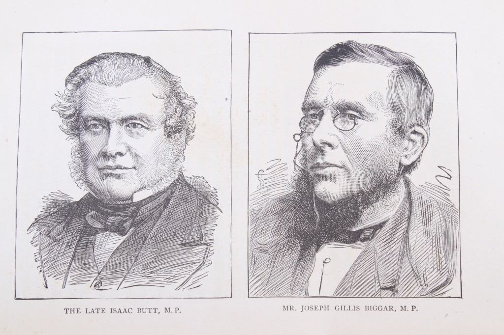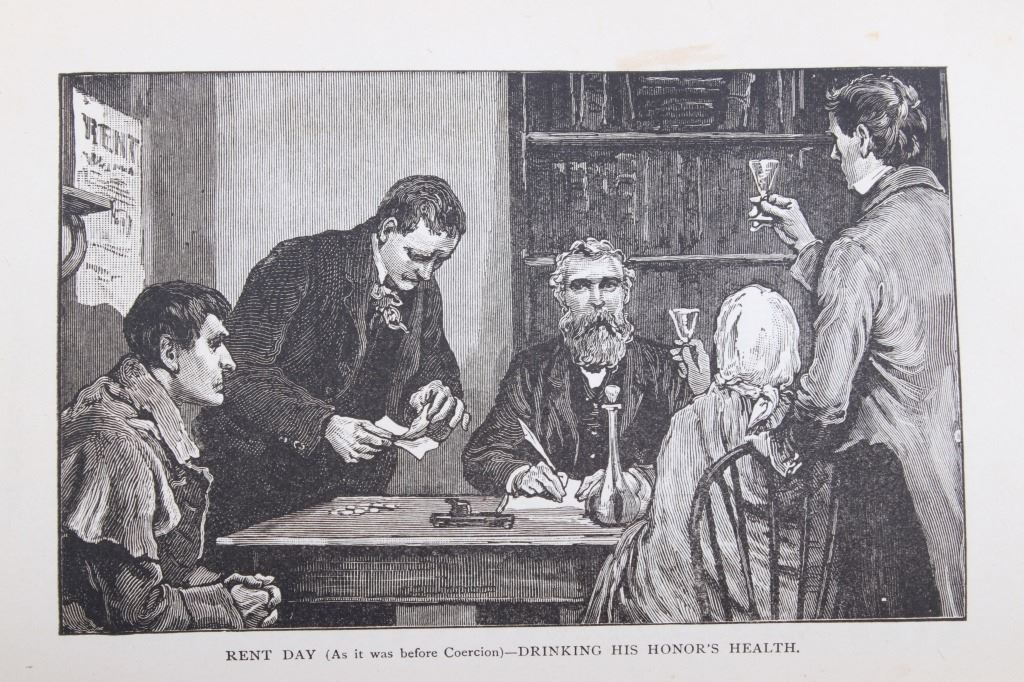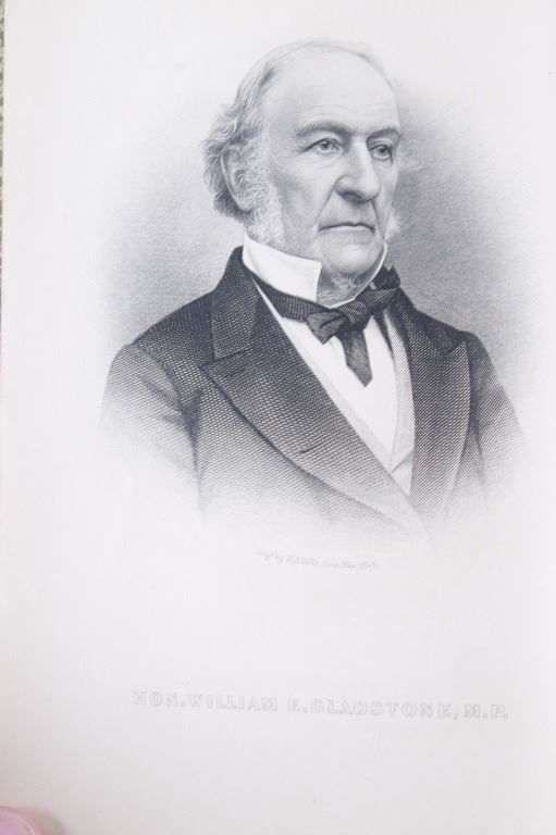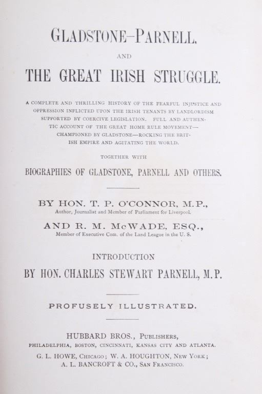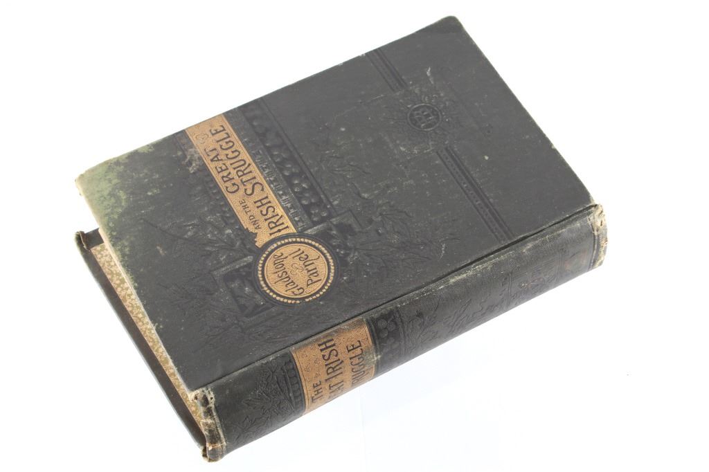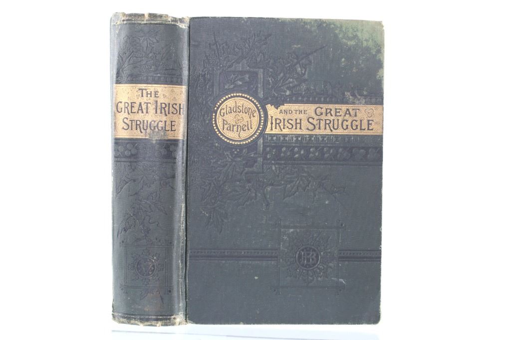 Included in this lot is an early edition of “Gladstone Parnell and The Great Irish Struggle” by T. P. O'Connor and Robert McWade, 1886 Hubbard Brothers publishing. The book is a graphic story of the injustice and oppression inflicted upon Irish tenantry and a history of the gigantic movement throughout Ireland, America, and Great Britain, etc. The book features numerous illustrations throughout the piece. Gladstone was a British statesman, Liberal politician, and former Prime Minister of the United Kingdom from 1880-1885, during which his government, in reaction to crises in Ireland, passed repressive measures but also improved the legal rights of Irish tenant farmers. Gladstone was the only prime minister to have served four terms. The cover of the book displays green cloth, gold embossed cover and spine. The piece displays good condition overall, with some light wear across the piece due to age; the rear cover is coming loose from the spine binding. The book measures 8.5" H x 5.75" W x 1.5" D.