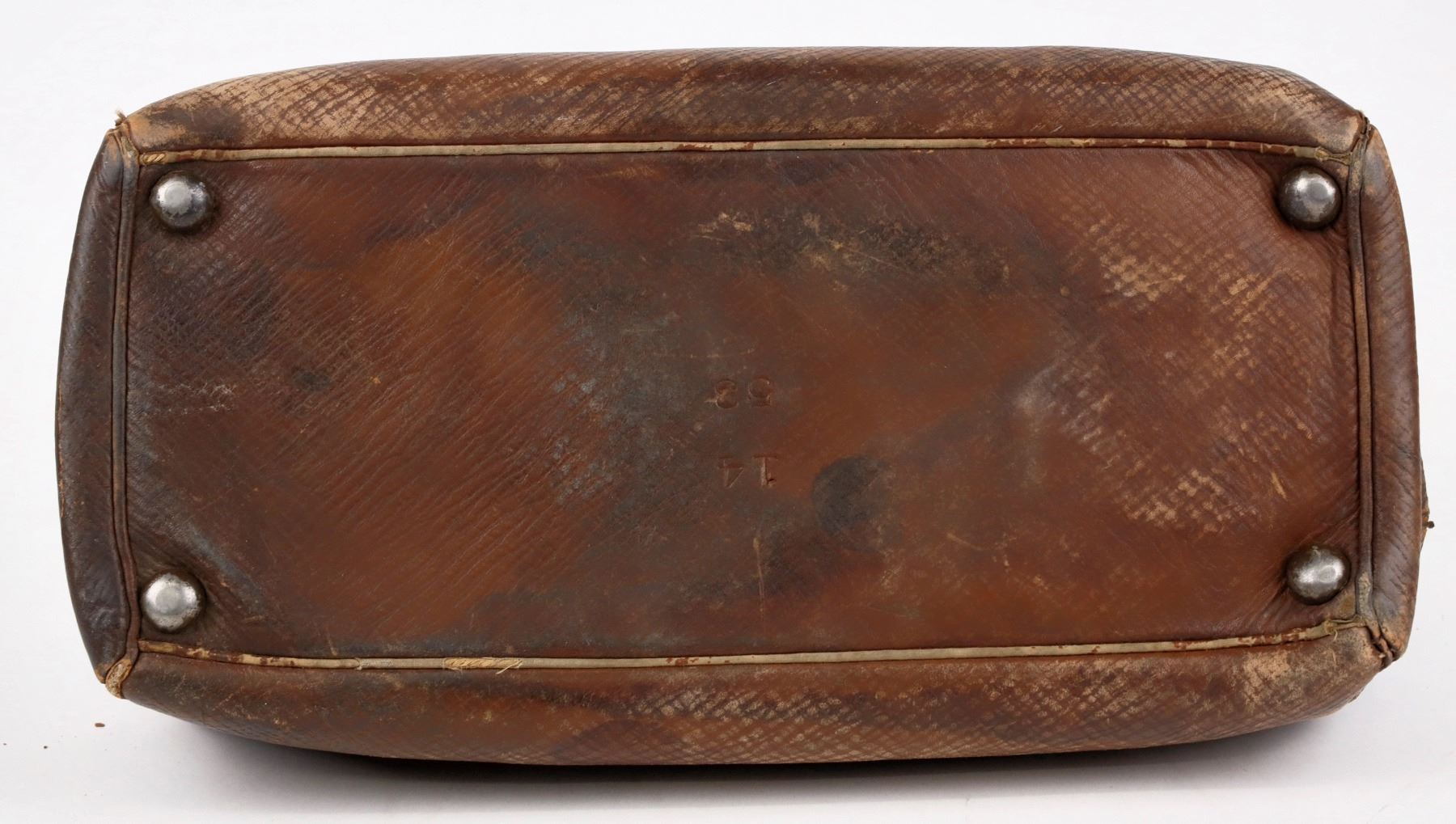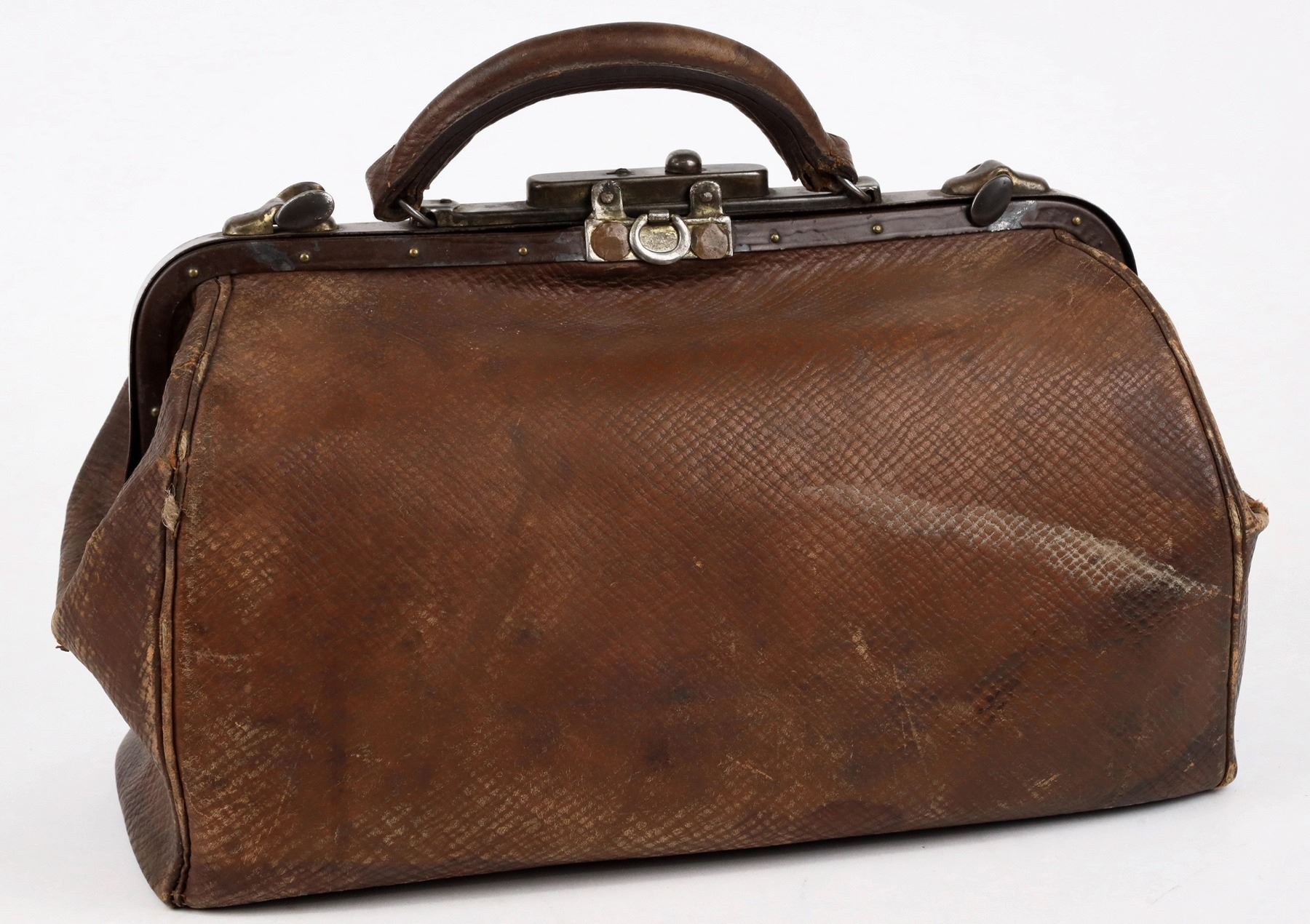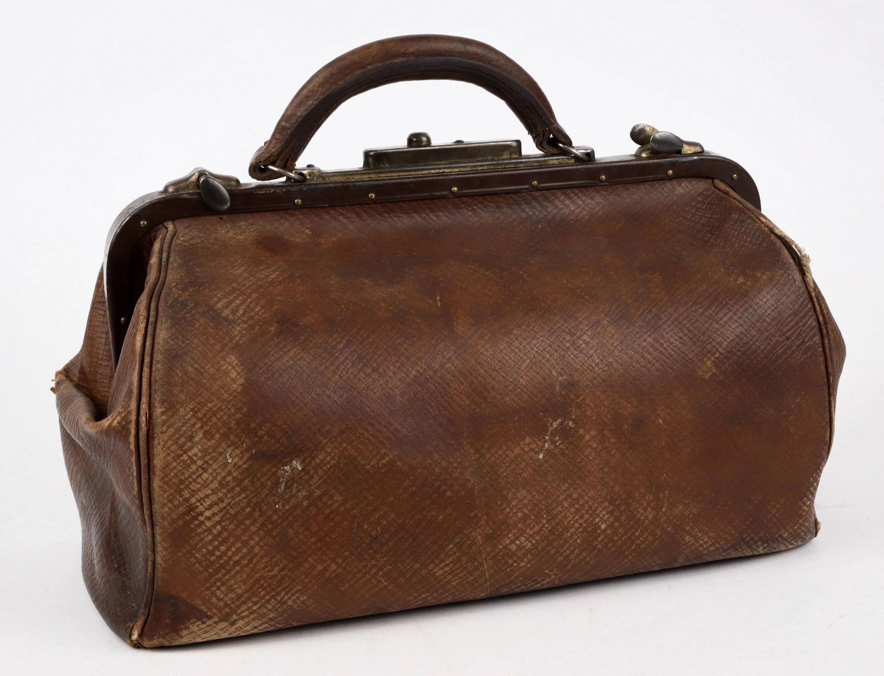 This is a doctor's bag of the Gladstone design at 16 in. X 9 in. X 7 in. A cowhide leather bag with unique rabbit ear locks on both ends. Lightly worn fully functional. C.1900. Please see photos for details.