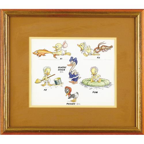 <B>"Gladys Goose" Model Sheet Original Art (Walter Lantz Productions, undated).</B></I> Walter Lantz Productions produced this delightful model sheet featuring Gladys Goose, and siblings, Fe, Fi, Fo, Fum, and Phooey. The image area measures 11.5" x 9.25". Matted and framed and in Excellent condition. <BR><BR><B>Important notice:</B> Heritage usually auctions material at the rate of 200-250 lots per hour. On some occasions eBay Live bid software or the Internet may not be able to keep up with the pace of the auction. We recommend placing a realistic absentee bid now as insurance to avoid disappointment. Occasionally the auctioneer may eliminate or reject an eBay Live bid, and the auctioneer may also reopen a lot after the close of the eBay live bidding (usually because we missed an audience bid), and may reject your bid even if it shows you as the winning bidder. By bidding via eBay Live, you agree that Heritage may award the lot to another bidder at its sole discretion under the circumstances described above or any other reasonable circumstances. Since eBay bids are not shown to us until we open the lot on the floor, we treat those bids just like floor bids. In most cases the floor responds before the eBay bid is presented to us, due to Internet lag time, so for consistency we have made it a policy that floor bids are always considered first over tie eBay live bids. Also please note that all Heritage lots purchased through eBay Live carry a 22.5% Buyer's Premium. Please make sure you read the Terms and Conditions before you bid. This lot is being auctioned in conjunction with a live floor auction by Heritage Auction Galleries. All final auction and invoice information will be supplied by Heritage Auction Galleries, and all other information should be considered preliminary. Lot:41001 <BR><BR><B>Winning Notification and Billing:</B> After the FINAL session in this auction is complete, Heritage will send e-mail and snail mail invoices. This process normally takes several days. All final auction and invoice information will be supplied by Heritage Auction Galleries, and all other information should be considered preliminary. <BR><BR>This auction will be conducted on a live auction floor and over the Internet through eBay Live. If you choose to place an absentee bid, please take a moment to <font color='#0000ff'><u><a href='http://pages.ebay.com/liveauctions/help/before/laabsentee.html'>learn how eBay Live absentee bidding works</a></u></font><font color='#000000'>