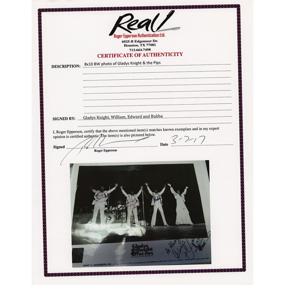 Glossy 10 x 8 SAS Inc. publicity photo of Gladys Knight and the Pips performing on stage, signed in black felt tip, "As always, Gladys Knight, 1978," and by Bubba Knight, William Guest, and Edward Patten. In very good condition, with overall creasing. Accompanied by a full letter of authenticity from REAL.