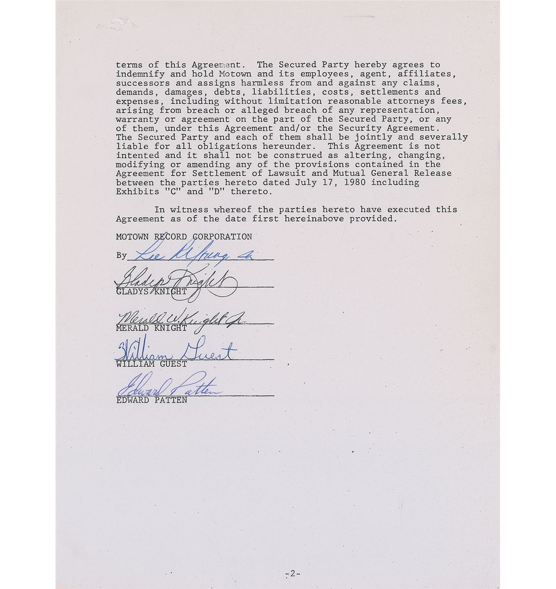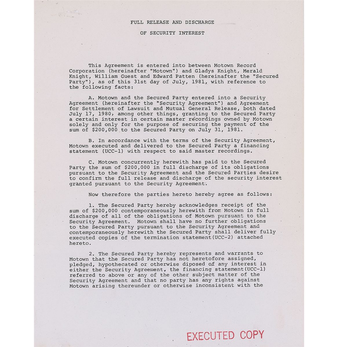 DS, two pages, 8.5 x 11, July 31, 1981. Release and discharge of a security agreement between Motown and Gladys Knight and the Pips, with the band receiving a payment of $200,000 from the Motown Record Corporation. Signed on the second page by Gladys Knight, Merald Knight, William Guest, and Edward Patten. In fine condition, with staple holes to top left corners.