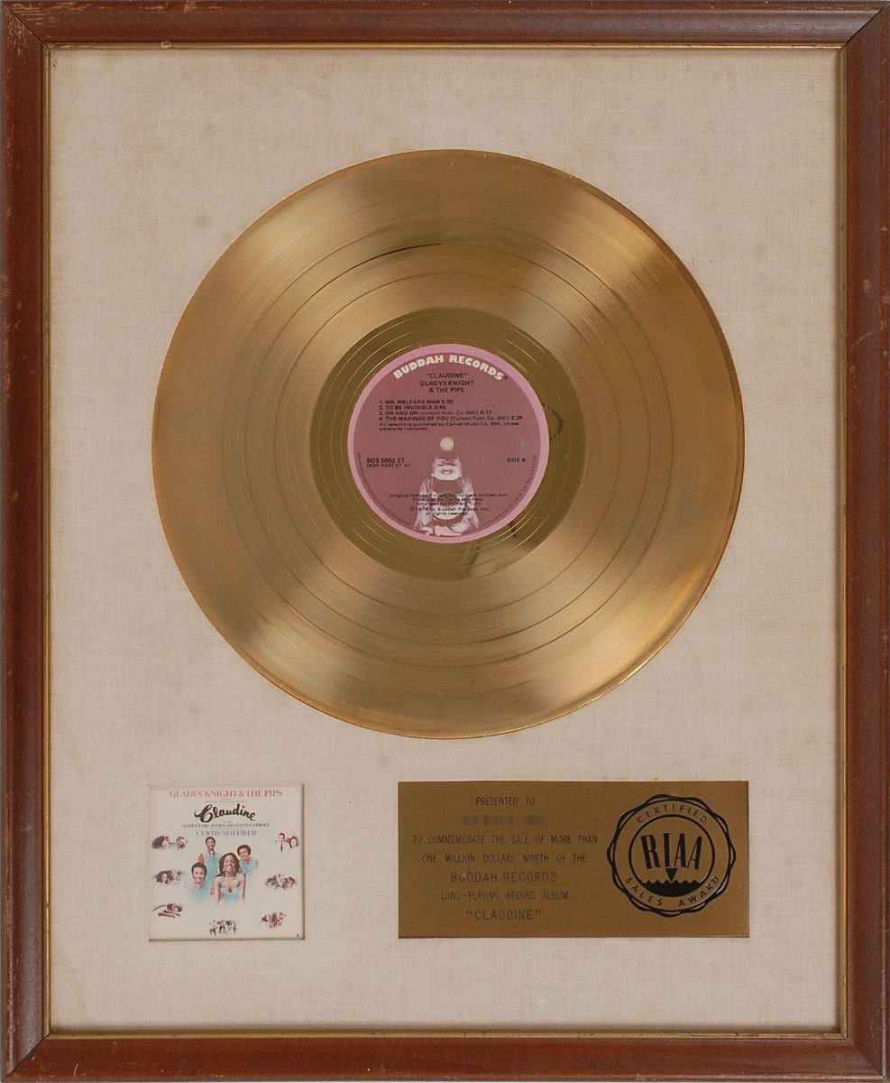 Official white-matte RIAA gold sales award presented “to commemorate the sale of more than one million dollars worth of Buddah Records long-playing record album ‘Claudine.’” Framed with its disc, plate, and a small image of the album cover to an overall size of 17.5 x 21.75. Award retains its original backing with a New York Frame & Picture label. In fine condition.