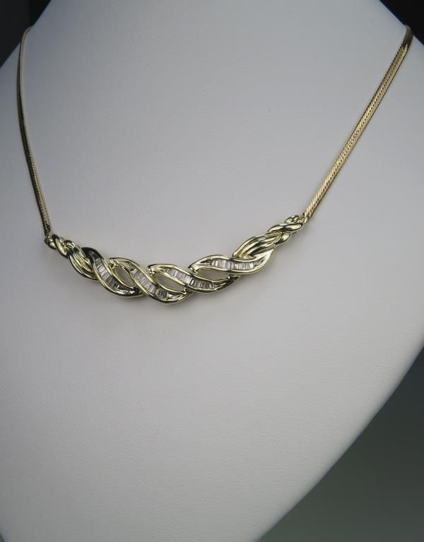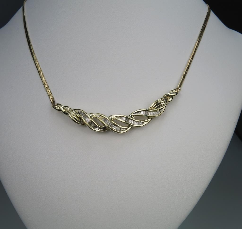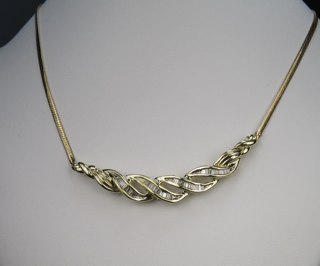 Glamorous Diamond Necklace with 40 baguette cut Diamonds weighing approx. 1.20-1.50 carats with G-H colors and SI clarity set in 9.00 grams of 10 karat yellow gold. Retail $2,600-$2,900 Estimate $1,400-$1,800