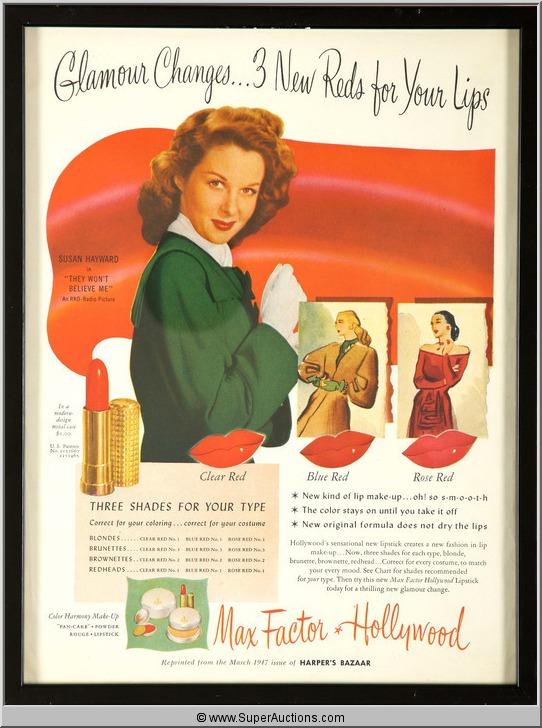 Glamour Changes Lipstick Advertisement 1947 Featuring Susan Hayward {Max Factor Collection}