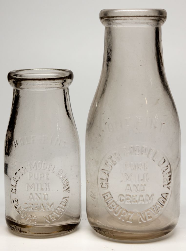 Lot of 2. The slug plates for both read “Glaser Model Dairy Elburz Nevada Pure Milk and Cream.” 1) Half pint with very little wear. 2) One pint with some minor wear. These bottles are common with more than 10-15 known. It should be noted that a “common” rating in some other western states would indicate a rarity of perhaps 25 or more known [Ref: Nevada History Through Glass, Vol I, Fred Holabird, 2012]. - Ferraro Collection -60413