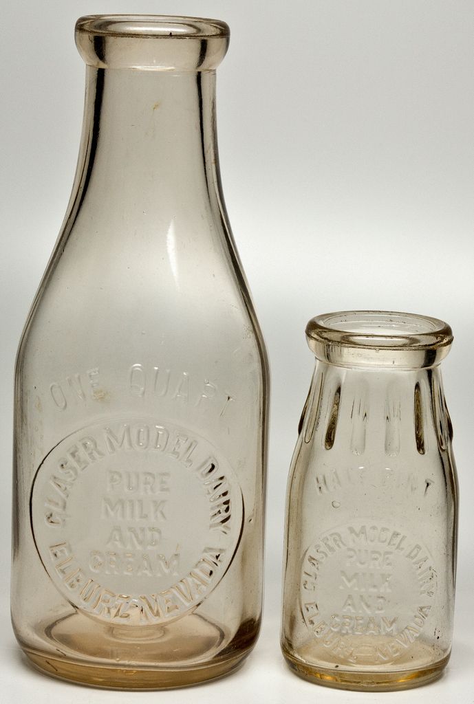 Lot of 2. 1) Half pint, some wear including minor stains. 2) One quart some wear including minor stains. Both slug plates read “Glaser Model Dairy Elburz Nevada. Pure Milk and Cream.” - Ferraro Collection -59349