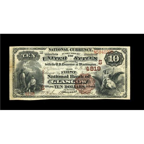 <B>Glasgow, KY</B></I> - $10 1882 Brown Back Fr. 485 <B>The First NB</B></I> Ch. # (S)4819<BR>Just seven large notes are recorded in the Kelly census from this difficult to obtain institution, with this (and why should we be surprised here) the only Brown Back. Pen signed <B>Very Fine.</B></I>