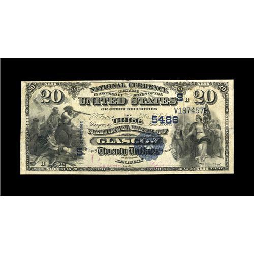 <B>Glasgow, KY</B></I> - $20 1882 Value Back Fr. 581 <B>The Trigg NB</B></I> Ch. # (S)5486<BR>This is one of fewer than two dozen $20 Value Backs known from the entire state, and the only example reported from any Glasgow bank. <B>Fine</B></I> or a touch better.