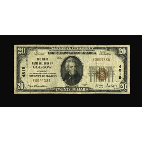 <B>Glasgow, KY</B></I> - $20 1929 Ty. 1 <B>The First NB</B></I> Ch. # 4819<BR> This becomes the first $20 note reported from here. The bank operated for almost 40 years before going into receivership in 1932. A couple of pinholes can be seen on this <B>Fine </B></I>example.<B><BR></B></I><BR><BR><b>Shipping:</b> Coins & Currency (<a target="_blank" href="http://www.heritageauctions.com/common/shipping.php">view shipping information</a>)
