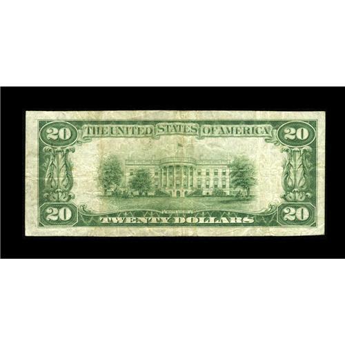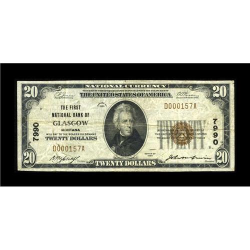 <B>Glasgow, MT</B></I> - $20 1929 Ty. 1 <B>The First NB</B></I> Ch. # 7990<BR>This <B>Fine-Very Fine</B></I> note was last sold at auction in November of 2001 for $605. It is one of only five of this type and denomination known from here. While two federally chartered banks were located in this small community, this was the only one with sufficient longevity to issue the 1929 series, the rival Glasgow National Bank entering receivership just a few days after Christmas in 1925.<BR><BR><b>Shipping:</b> Coin/Currency (<a target="_blank" href="http://www.heritageauctions.com/common/shipping.php">view shipping information</a>)