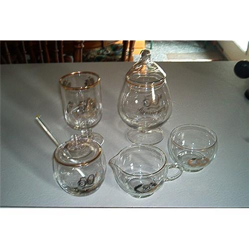 A wonderful 8-piece set of glassware with each piece decorated in gold: Happy 50th Anniversary. Creamer, Sugar bowl, Candy Dish, and two drinking glasses, along with two lids and also a glass spoon for the sugar dish. One drinking glass measures 2 3/4 inches tall; one drinking glass that measures stands 3 1/4 inches tall;3 1/4 inches diameter; The creamer measures 2 3/4 inches tall; depth of 1/2 inches; One drinking goblet measures 6 inches tall; opening diameter of 3 inches; depth measures 4 1/2 inches; All pieces are all 50th Anniversary items. No scratches, chips, etc. A total of 8 pieces. Great for giving as a gift to those special people that will be celebrating their 50th Anniversary.