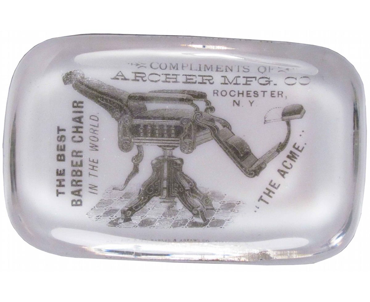 Glass Advertising Paper Weight Acme Barber Chair. Compliments of Archer Mfg. Co. Rochester, NY. Excellent condition. 4 X 1 X 2 1/2 inches.