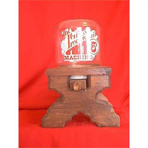 Machine has a wooden bottom and glass canister that holds the peanuts. The front is marked "The Great American Nut Machine 5 Cents." You pay your nickel and pull the drawer out and get your peanuts. The knob is not original but other than that it is in very good condition. It measures 11 inches high from top to bottom and the stand is 6.25 inches wide.