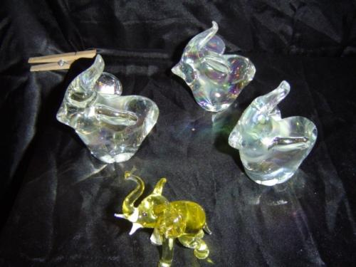 Four piece collection of glass elephant figurines, three 3.75" clear opalescent from China and one 3.25" hand blown, yellow glass elephant from St. Petersburg, Russia