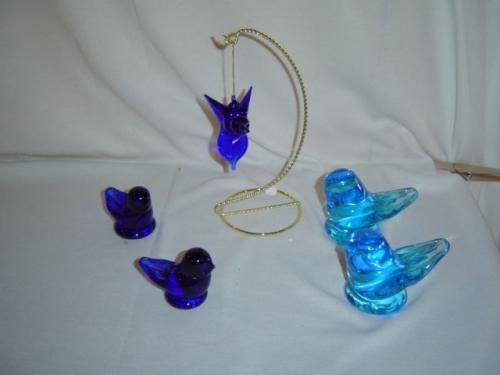 Six piece collection of glass figurines including: two 3.75" Sunny Day Blue Birds, two 2.5" royal blue Sunny Day Blue Birds and a 3" X 3" royal blue Sunshine Factory Hummingbird with hanger.