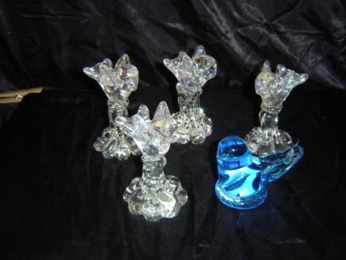 Five piece collection including: four 4" clear opalescent bird on pedestals hanger and one 3.75" Sunny Day Bluebird.