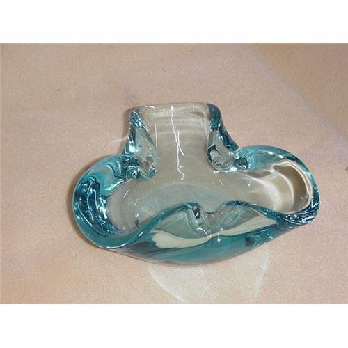 A modern design glass ashtray, 7 1/2" in diameter, aqua color. Unsigned. Polished bottom. Condition is very good the bottom is lightly scartched form wear.