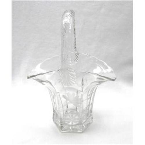 Elegant Glass Basket. Etched Flowers and Trim Design on Both Sides. Circa 1940. 9" tall. Excellent Condition.