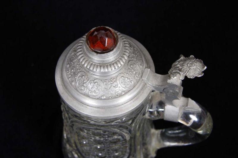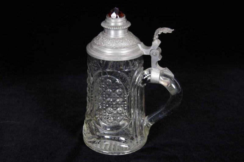 Glass Beer Stein from Germany Marked .45L, with beautiful pewter lid, cast decoration, and amber birthstone on top. 9"H, Circa 1900. These tankards/steins were kept in beer halls for regular customers and shelved behind the bar. These fancy glass steMarked .45L, with beautiful pewter lid, cast decoration, and amber birthstone on top. 9"H, Circa 1900. These tankards/steins were kept in beer halls for regular customers and shelved behind the bar. These fancy glass steins were used by wealthy patrons verses the ceramic.
