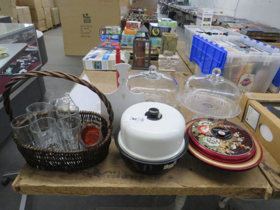 Glass Cake Stands, Basket, Asst. Table Items