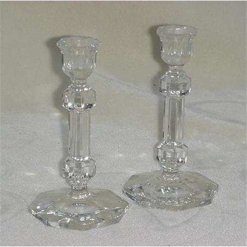 A pair of 6 1/4'' tall glass candlesticks, 3 3/8'' octagon base marked on underside with monogram large C with Rc inside.