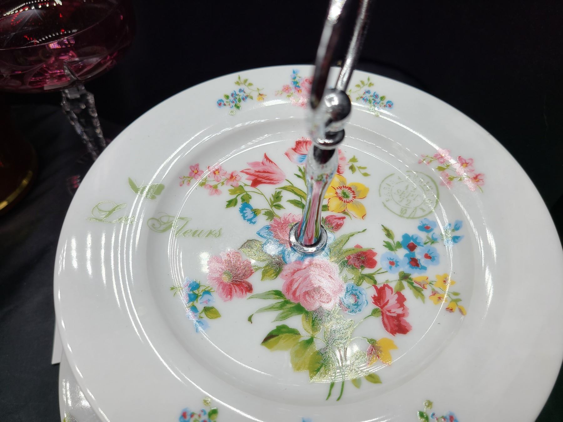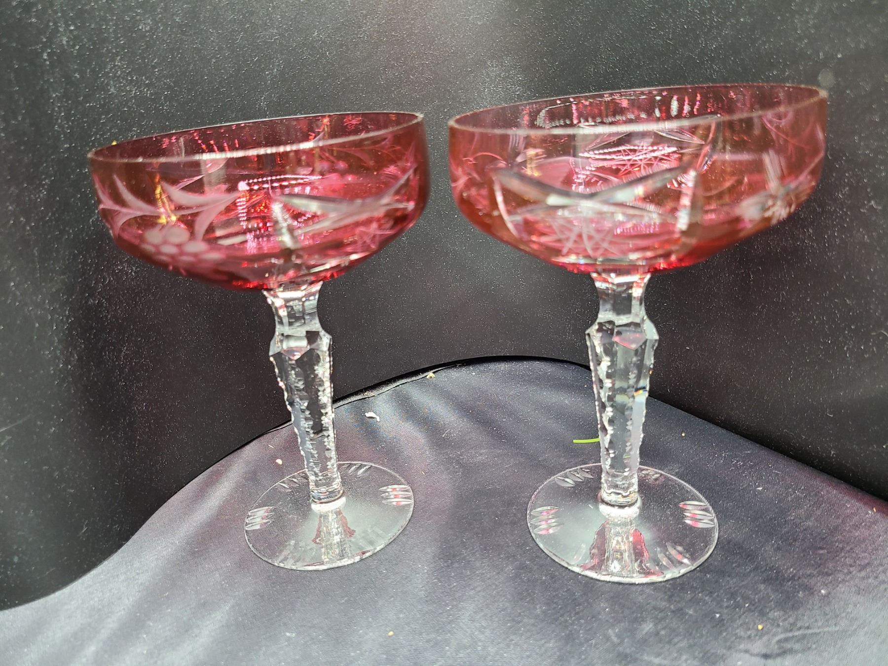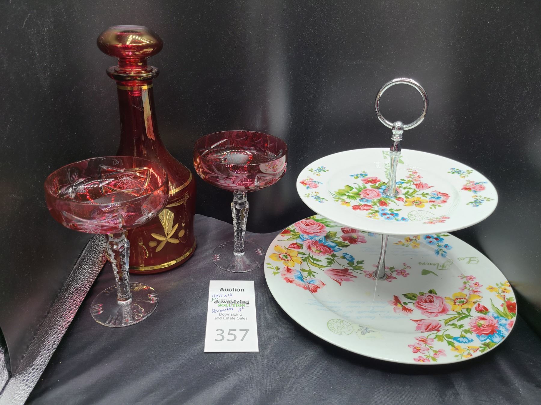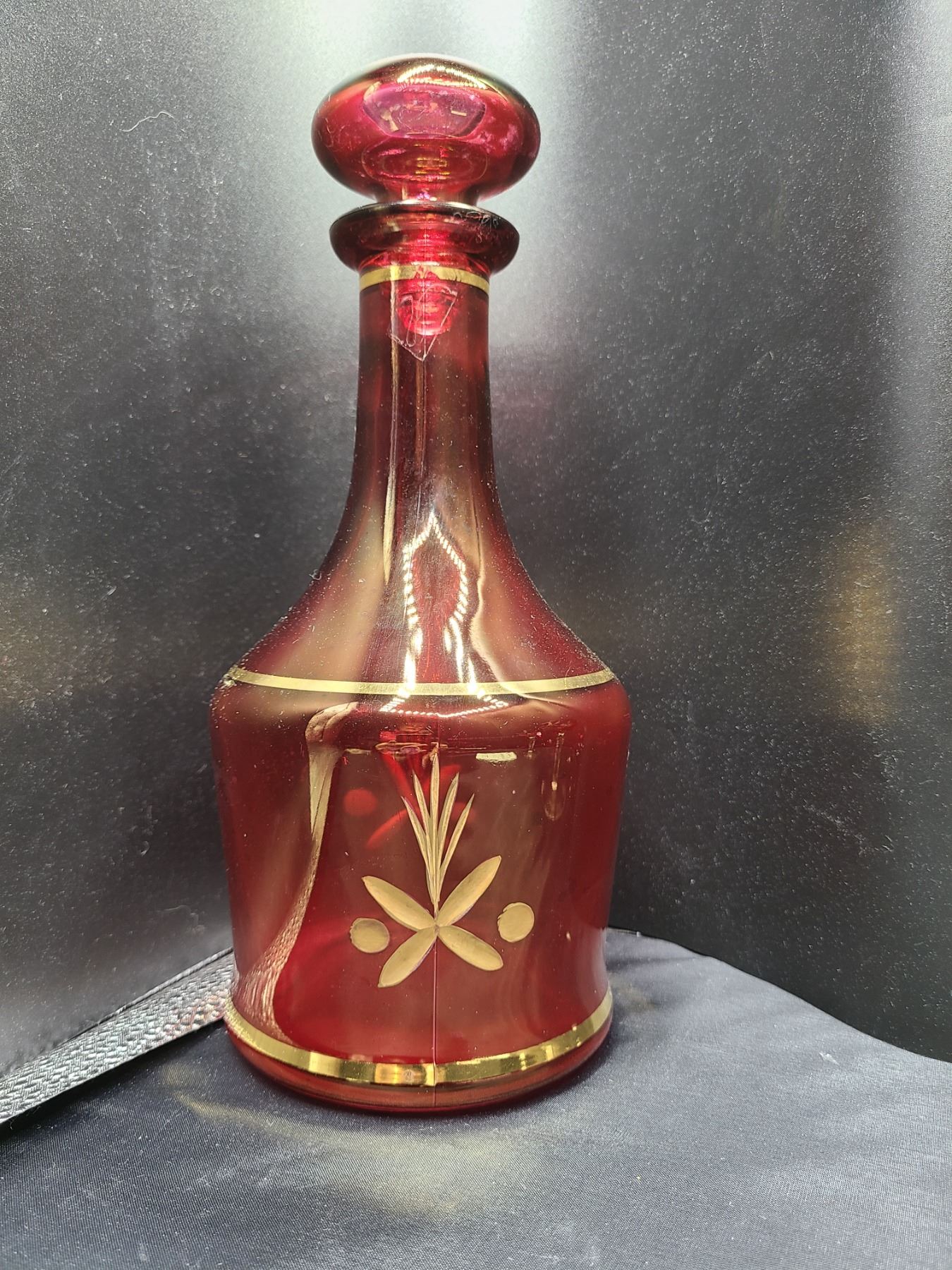 Red Glass decanter with gold overlay pattern 11" with two wine goblets. Cate stand 11x11x10. Bring packing material and pickup at 10 am
