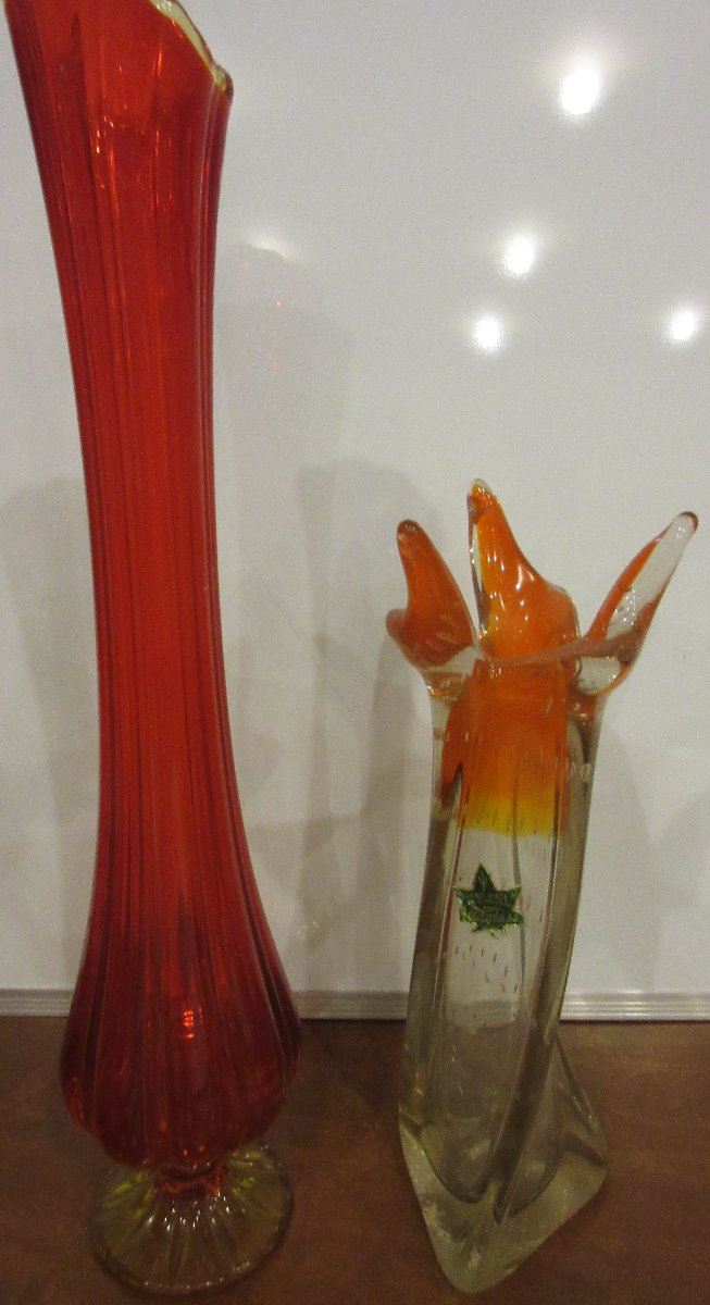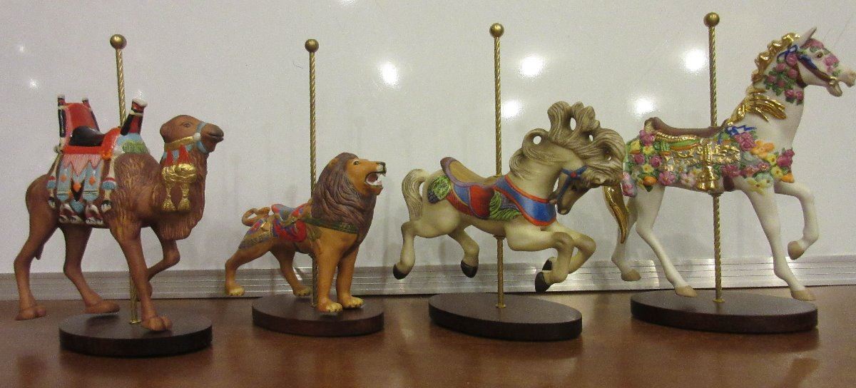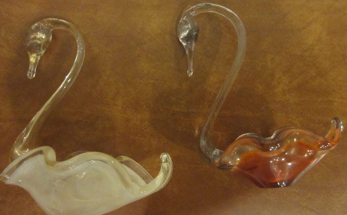 two Beautiful vases, Alta Glass, nice change tray native design made in Austria, Nice Canadian Motif change tray Lord Nelson Pottery England, Molded Glass swans 1 orange and 1 yellow Vintage Murano????, Partial Set of Carousel Animals
