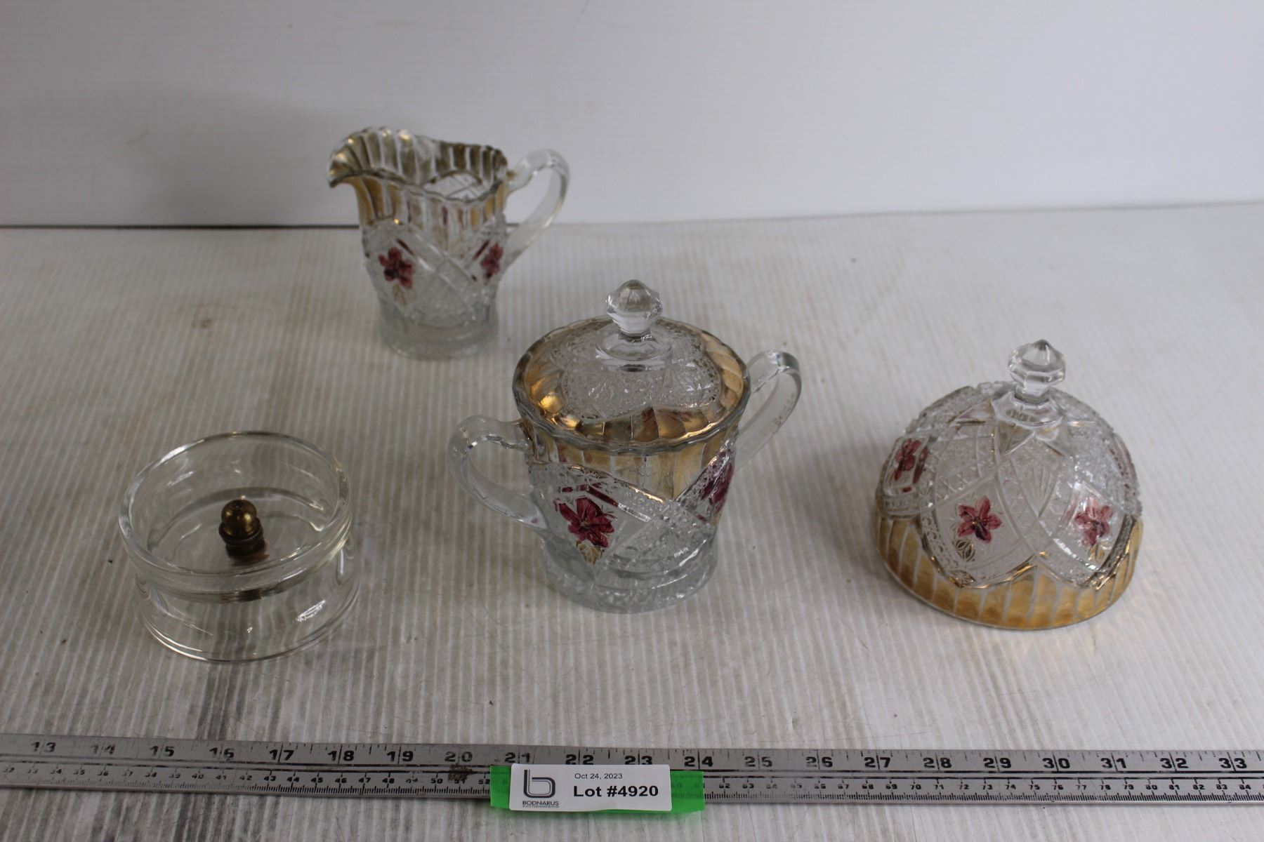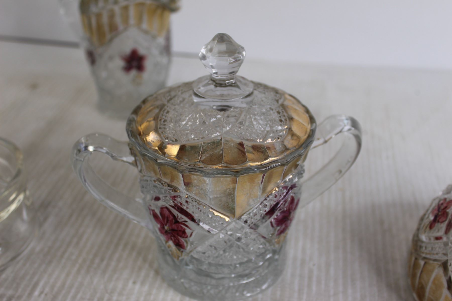 Glass Cream and Sugar Holders, Lid, and Small Spinning Dish