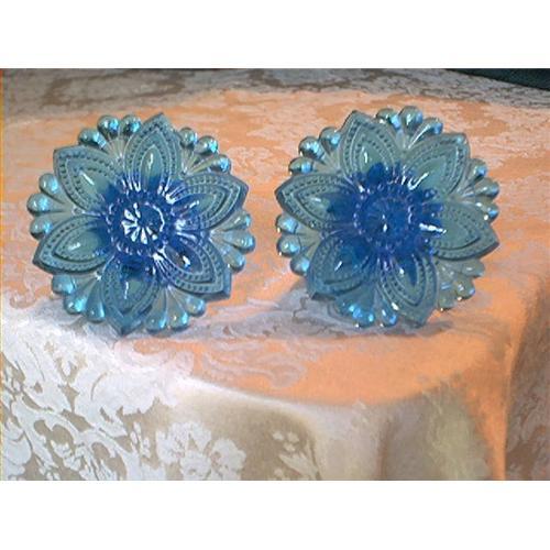 Curtain tiebacks of blue glass. Beautiful blue glass tiebacks shaped like a flower will add that extra touch. Could also be used as decorative towel holder in the kitchen or bath. Each tieback measures 2.5 inches from front to end of post or rod and 2.75 inches across the front. These tiebacks are in excellent condition with no chips or cracks. Price is for set of 2. These are NOT new reproductions.