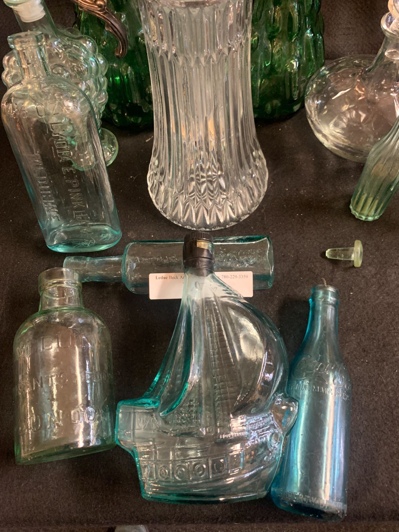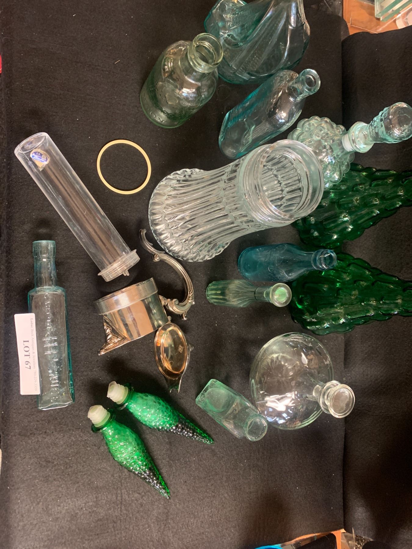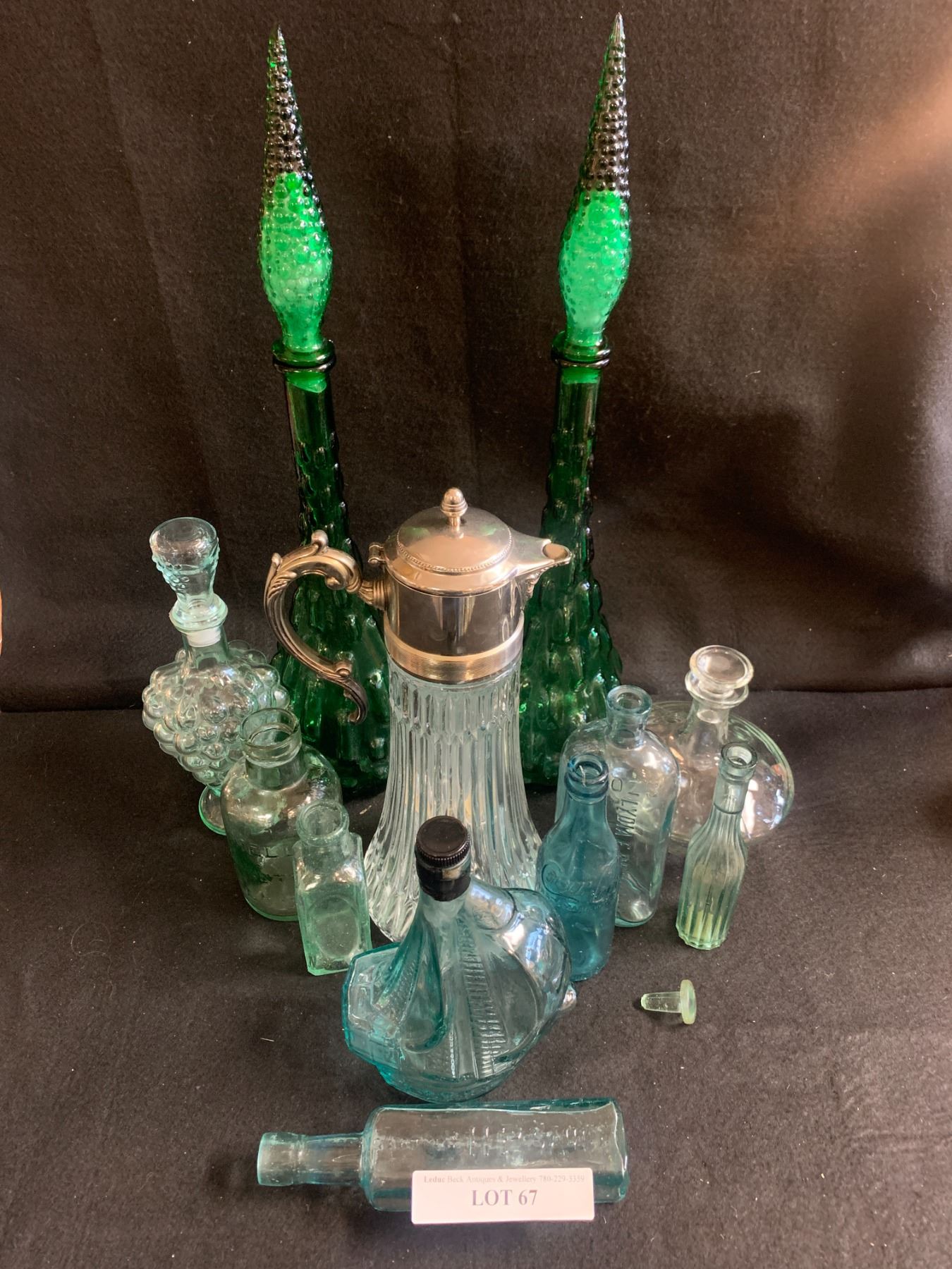 Glass Decanter, Asst Vintage Bottles and Two Mid Century Modern Green Jars w Lids