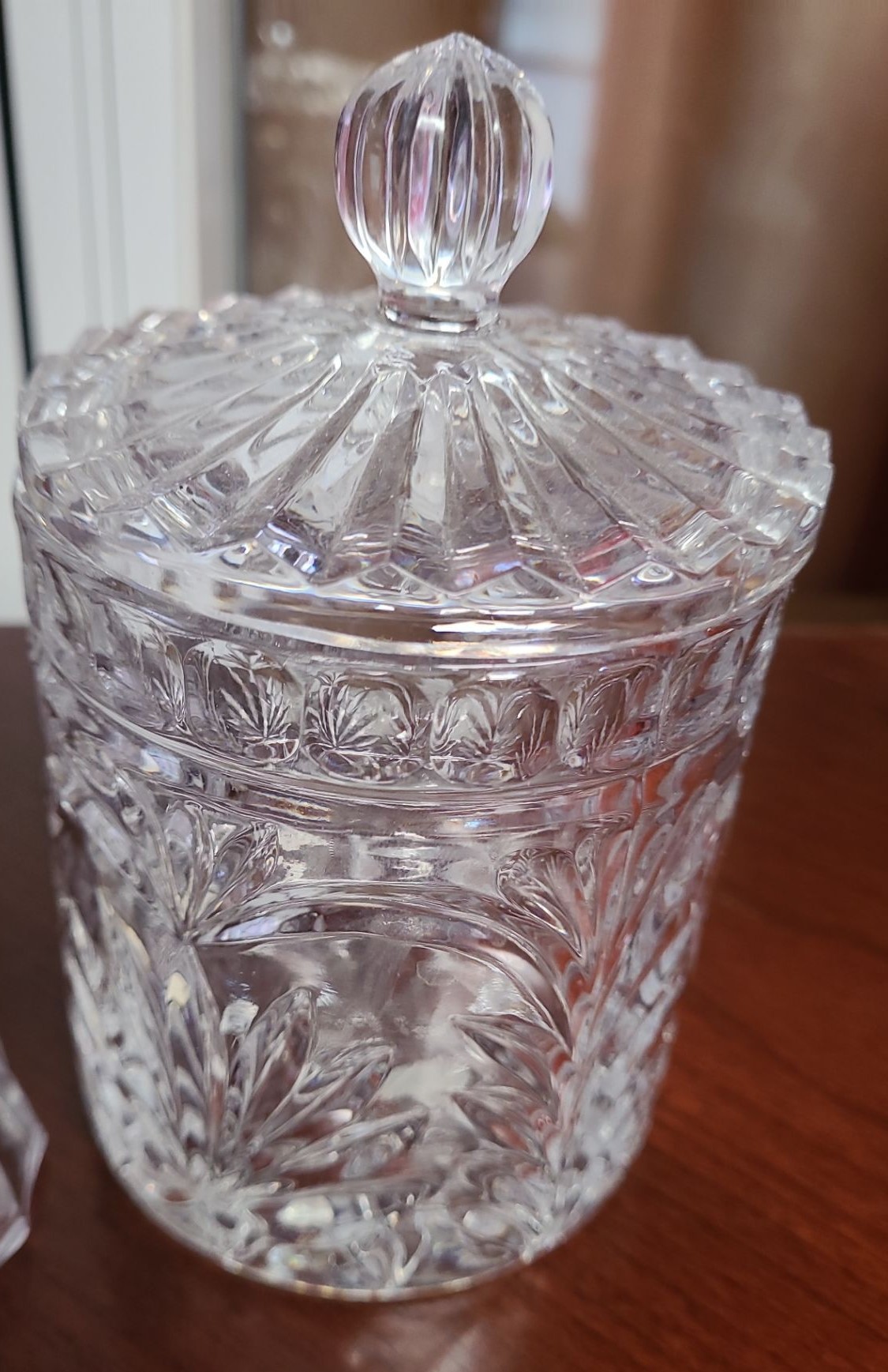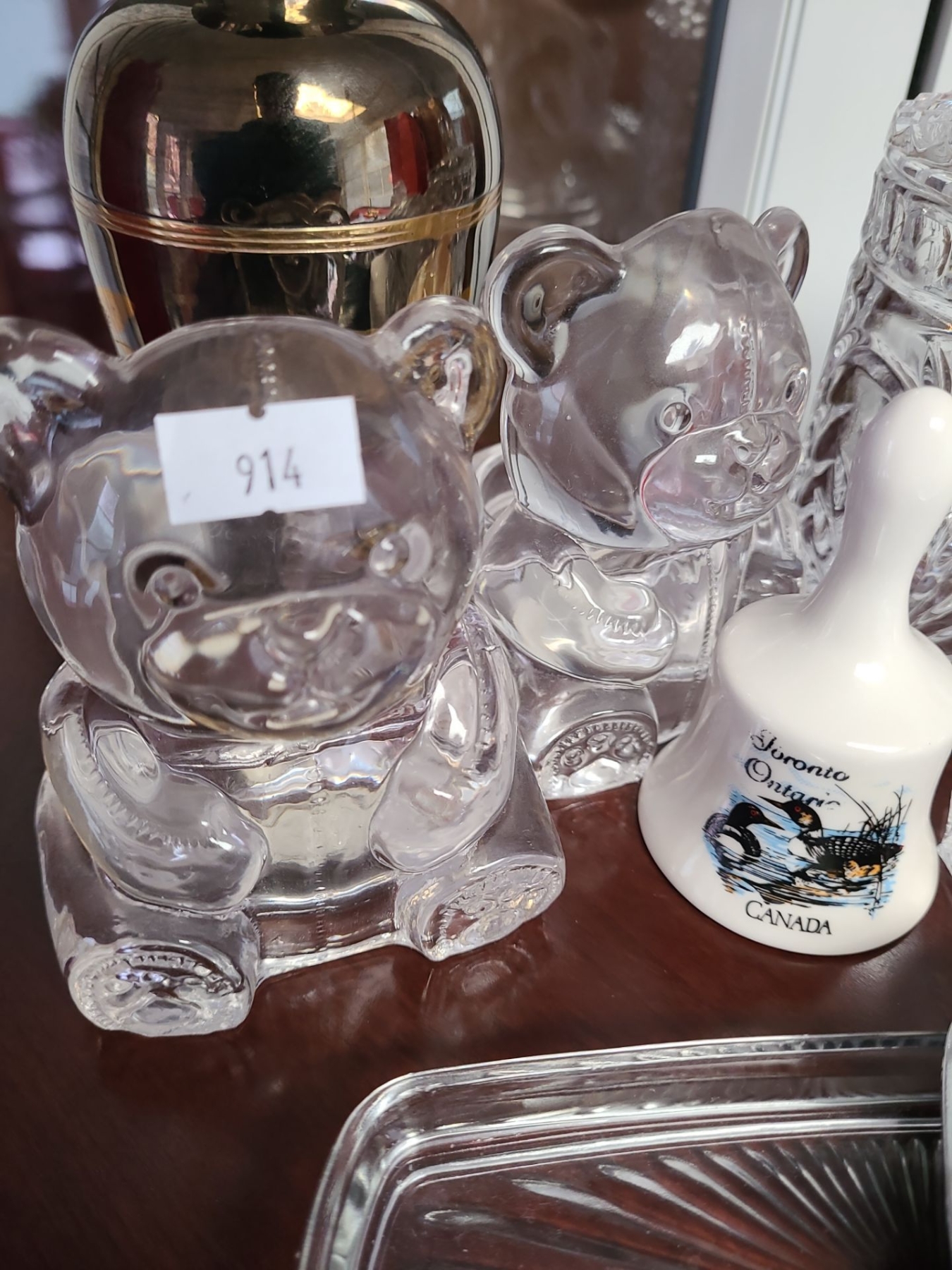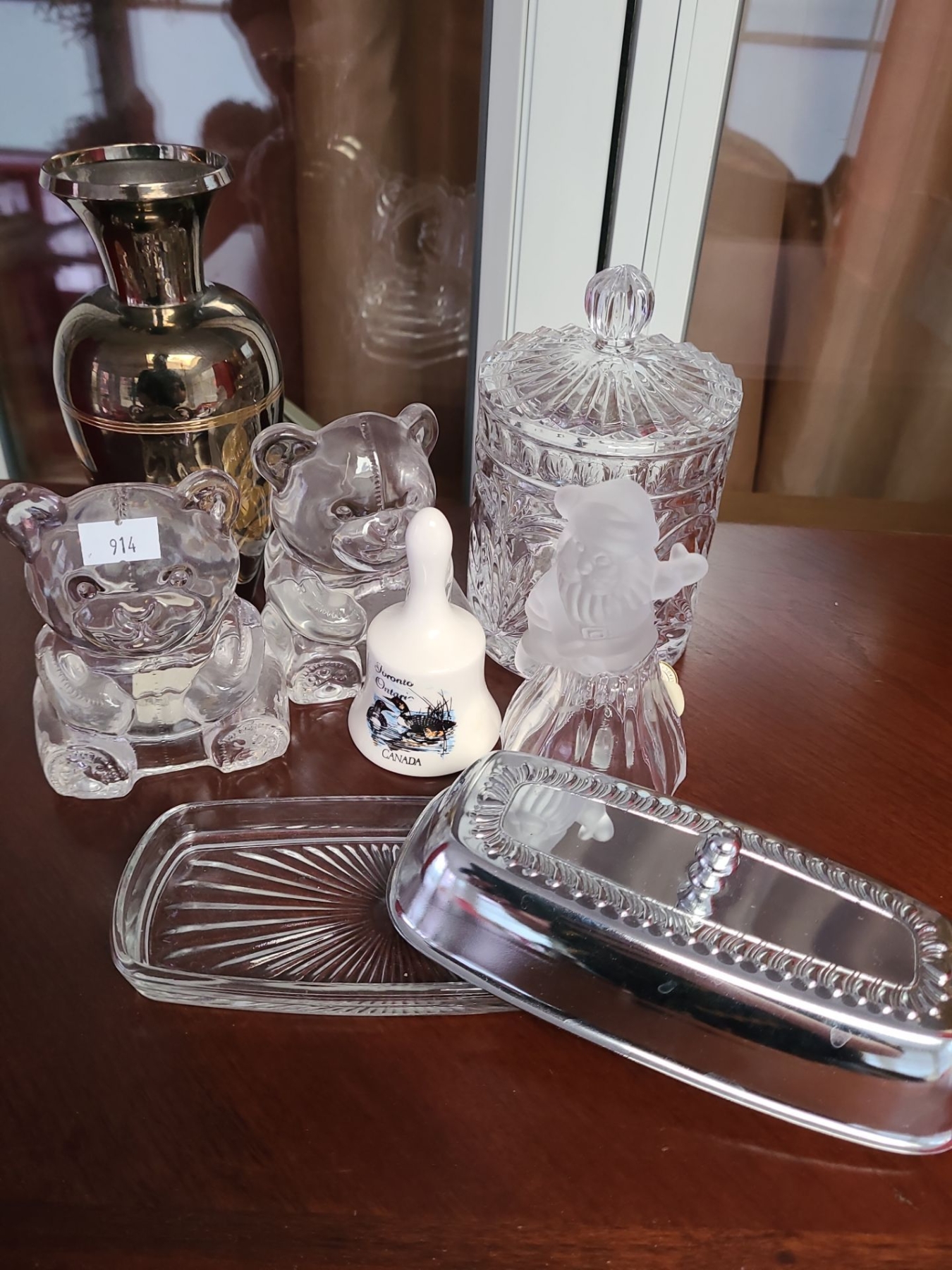 Glass Decor Including: Teddy Bears, Bells, Jar with Lid and Tray with Cover