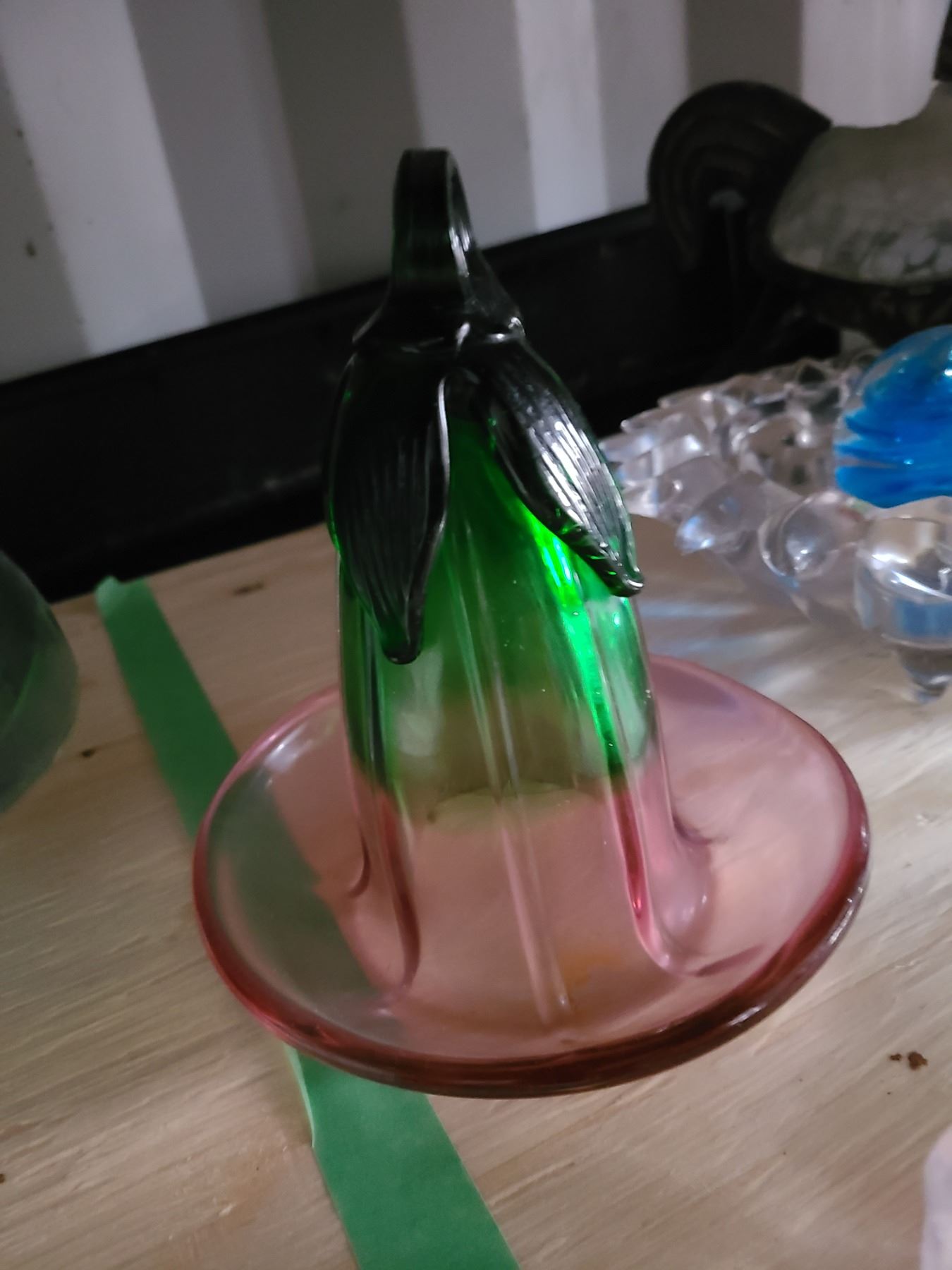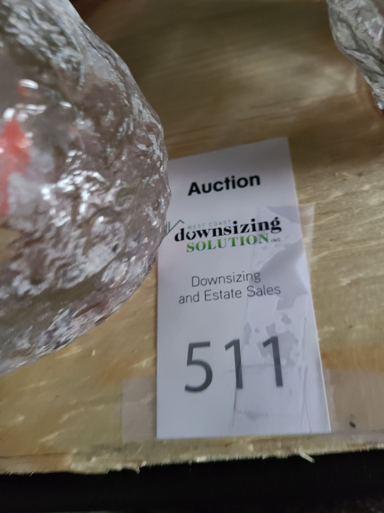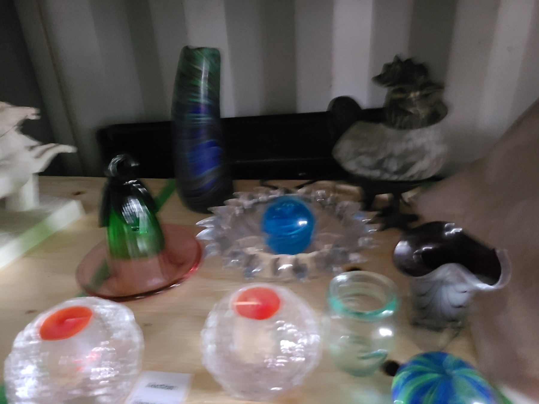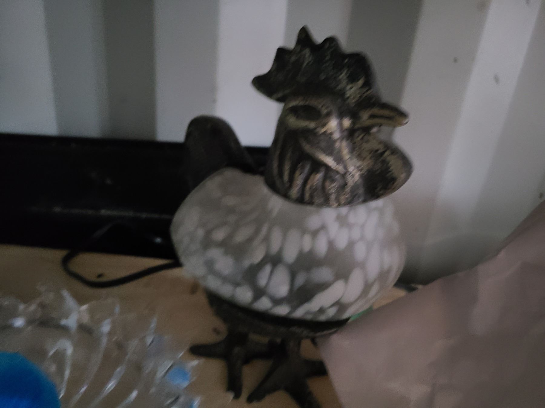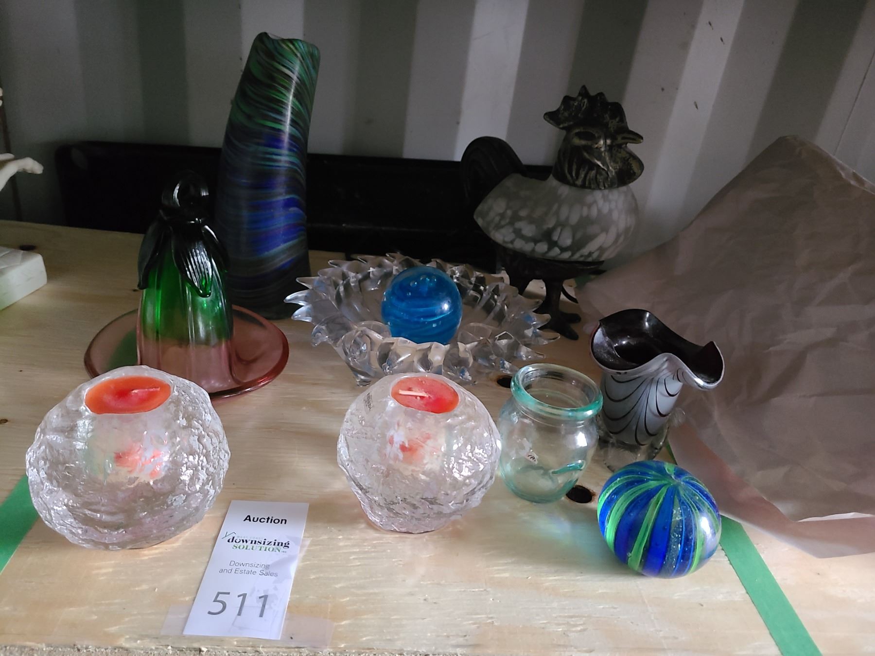 Glass candle holders, bowls, paper weights, vases, and rooster with glass shade lamp. Condition unknown. Pickup at 9 am.