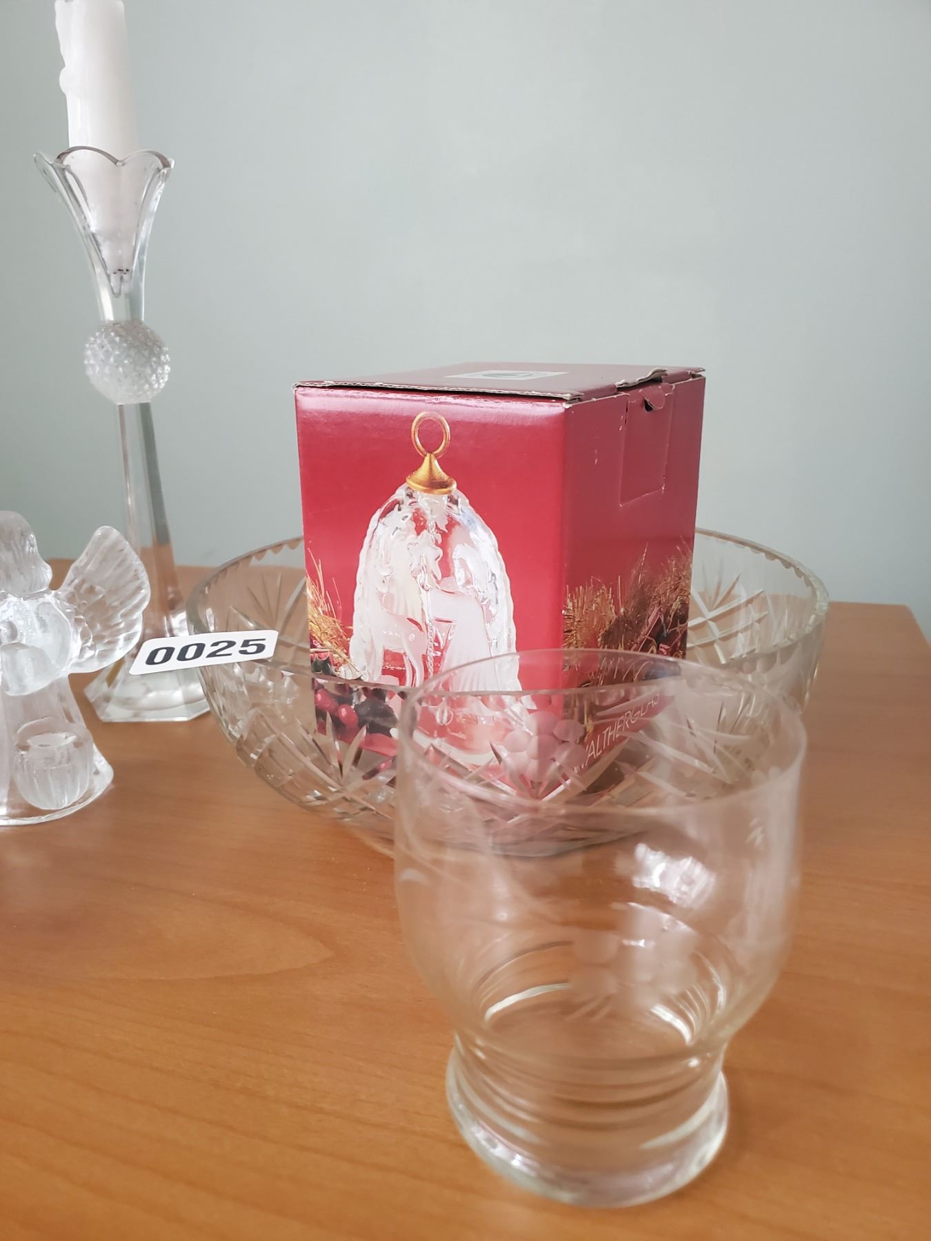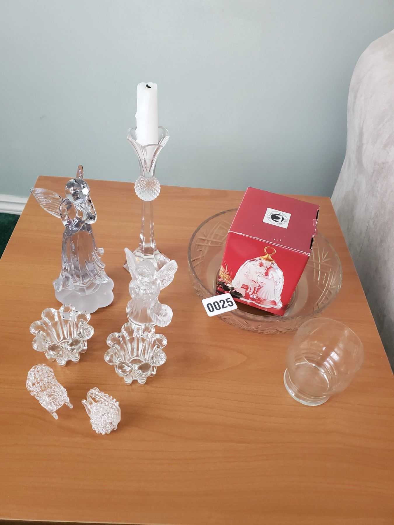 Glass angels, candle holders, chair & kettle etc