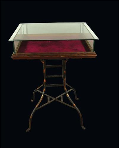 Glass Display Top Table, with copper flash base. All original, excellent condition. Table top 24 inches square X 31 inches tall.