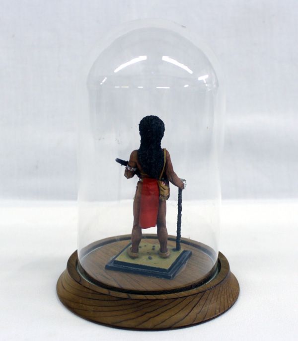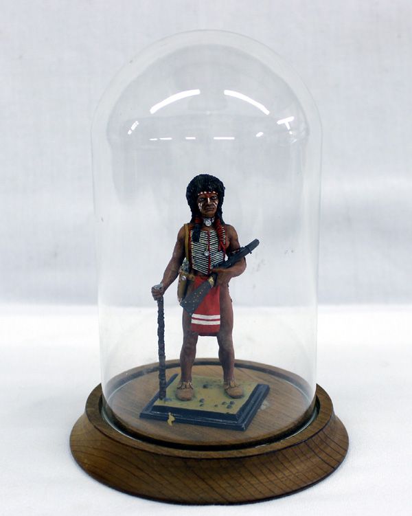 Glass Domed Statue of Native American. This sweet piece depicts a Native American in beaded breast plate with rifle and walking stick. It sits on a wooden base under a glass dome. Total measurement including base and dome is approx. 8''H x 5.5''W.