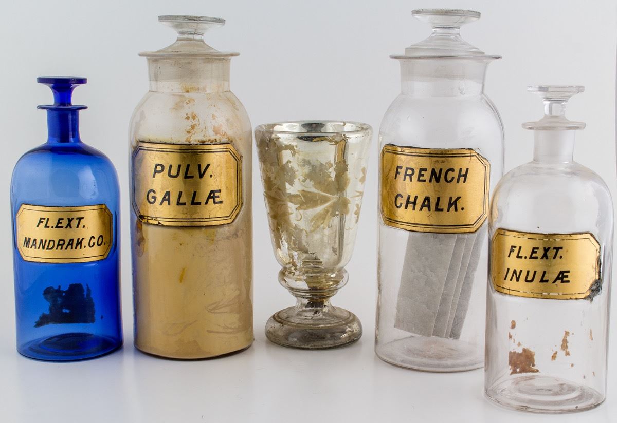 Group of five glass items from A.M. Cole's drug store in Virginia City. The group includes two label under glass master ground top drug bottles with original stoppers that held "Pulv. Gallae" and "French Chalk". Both bottles have AM Cole's paper label on the bottom, 9.5" tall, clear glass. A third bottle is a cobalt blue label under glass "Fl. Ext. Mandrak. Co.", 8" tall, with original stopper partial Cole paper label on back. A fourth example is a clear label under glass bottle "Fl. Ext. Inulae", 8" tall, with original stopper and remnants of Cole label on the back. The fifth example is a decorative hand-blown pestle, 6.5" tall, probably for window advertising. This piece is very early, perhaps 1850's. City: Virginia City State: Nevada Inventory Number: 39549