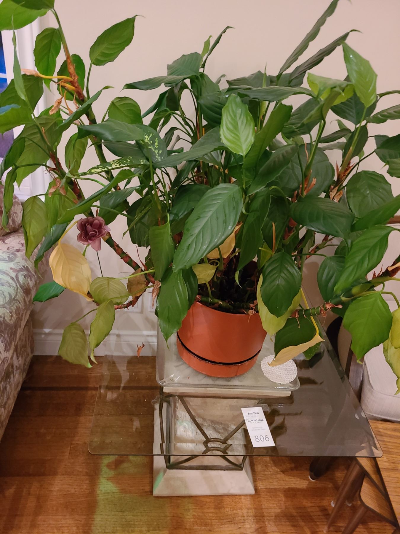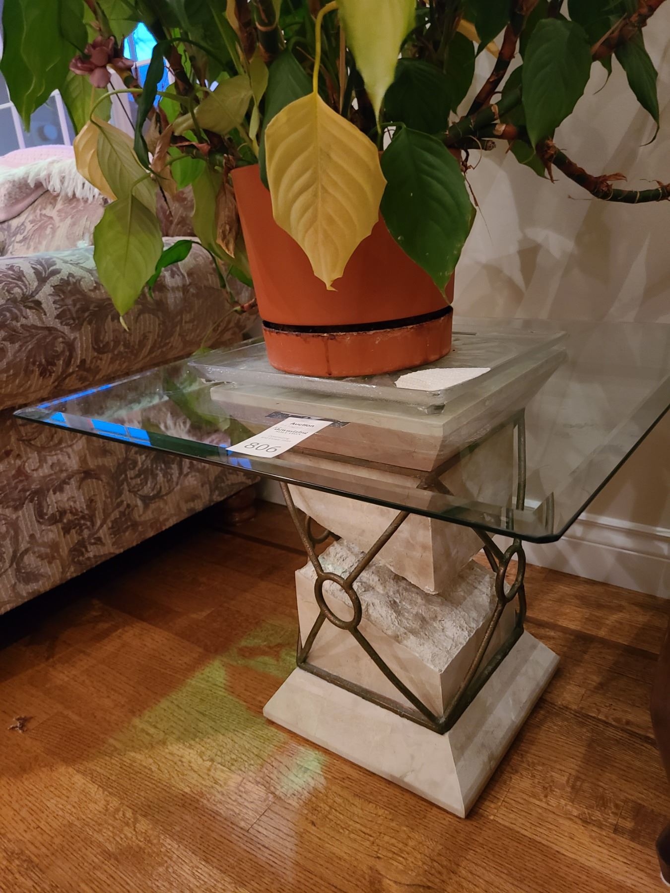 Glass top with faux marble base in metal surround. Pickup at 10 am