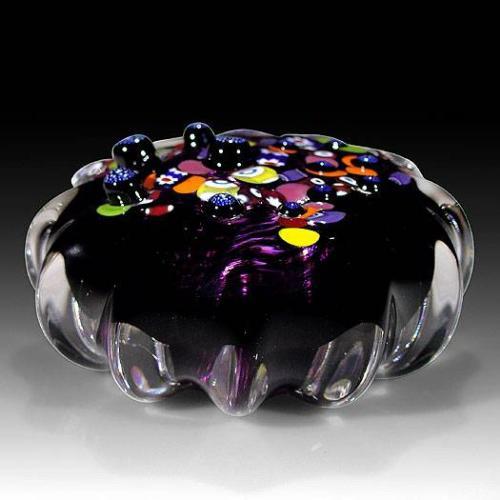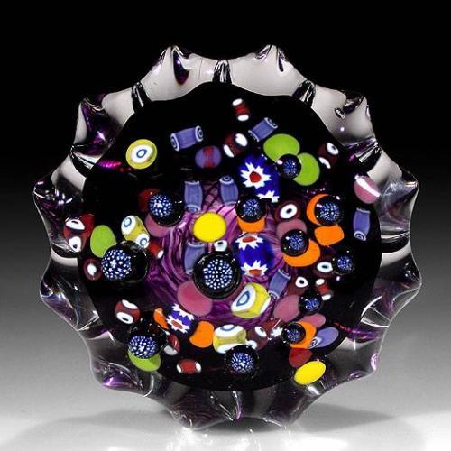 Glass Eye millefiori surface design low-domed paperweight. Blue and white complex star canes erupt from the surface of the piece, surrounded by several assorted complex canes, over a clear-encased translucent purple cushion. Fluted sides. "Glass Eye, Made in U. S. A." sticker on the base. Diameter 3 7/8".