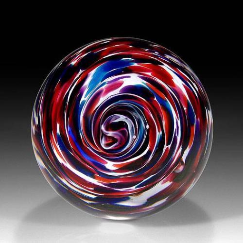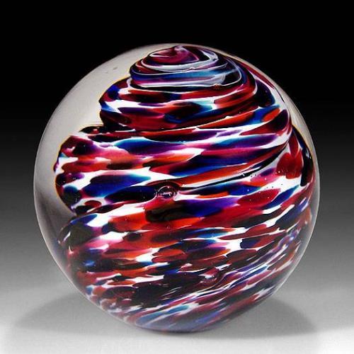 Glass Eye Studio 2001 abstract design paperweight. The piece consists of a clear-encased, spiraling, layered form, in red, blue, purple, and pink-dappled white. Signed/dated, "GES '01". Diameter 3 1/16".