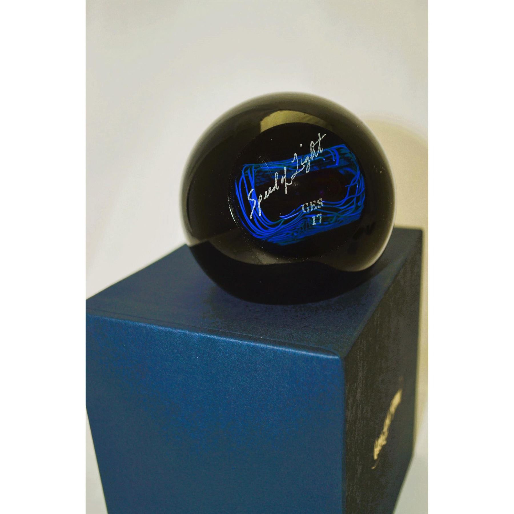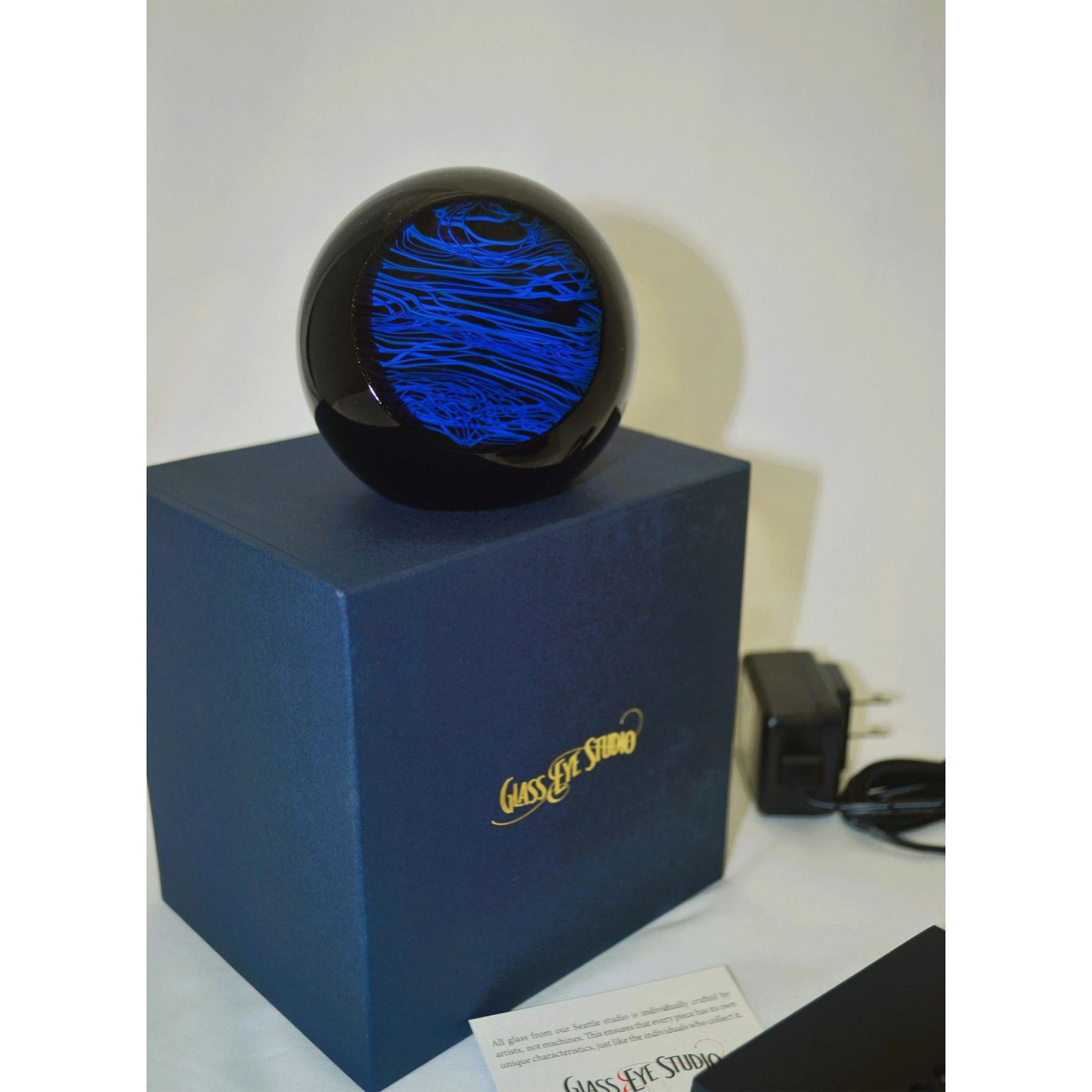 Hand created, hand crafted, each Celestial Paperweight is blown by the Artists of the Glass Eye Studio In Seattle, WA, USA. Designed and hancrafted by the talented glassblowers, featuring Speed of Light Paperweight, with Black Electric Light Base. Every Piece has its own unique characteristics, just like the individuals who collect this fine art glass. Inspired by all of the designer's interpretation of the scientific world, each weight takes a team of two or three artists to create. These PW's are carefully formed designs that use a wide spectrum of specialty colors, dichroic glass, glow material, and precious metals. All GES Paperweights contain ash from the 1980 Mt St. Helens eruption. SIze: 3"Diameter. Authentic GES Hallmarks, Signed, Dated: GES 2017. Original Blue Box from Glass Eye Studio. Excellent Condition. Never displayed, like brand new. Authentic Tent Card COA accompanies this Paperweight. Handmade, handblown by the artists of GES. Vintage. Electric Light Base included, black finish. From the Archival Collection of Re Vann Galleries, G.Reasoner, Owner.